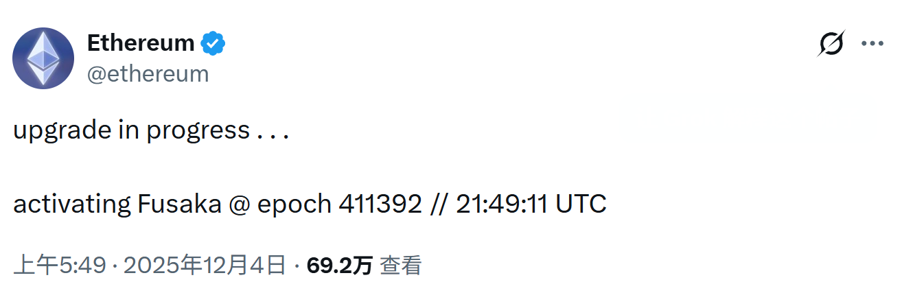 12 月 4 日,以太坊 Fusaka 升级正式在主网上激活,只是不像当年 Dencun 升级那样声势浩大,市场的聚光灯也多集中在 Blob 扩容与 PeerDAS 上,津津乐道于 L2 数据成本的进一步降低。