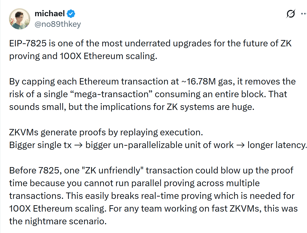 确实,更便宜的 L2 是好事,但对于以太坊长远的 ZK 路线图来说,EIP-7825 才是真正的游戏规则改变者,因为它给以太坊的单笔交易设置了一个 Gas 上限(约 1678 万 Gas)。