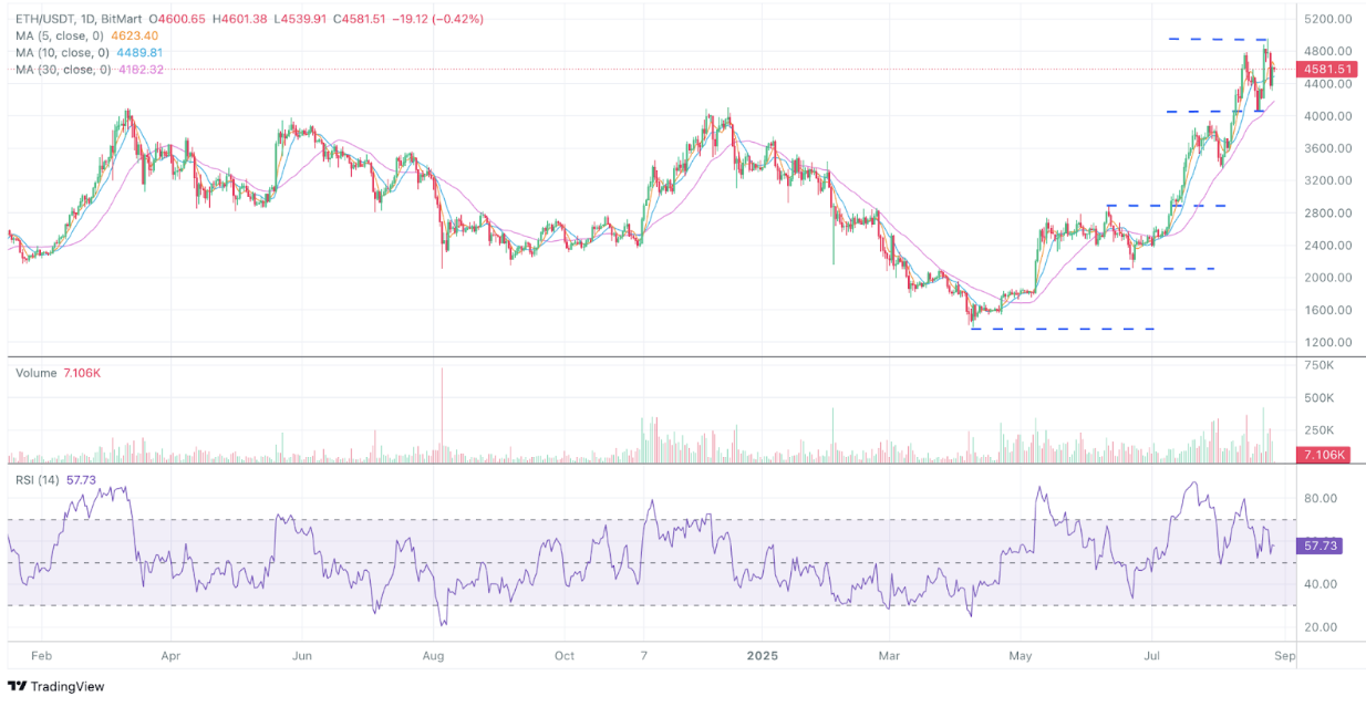 8约以太坊表现超过比特币并领跑市场,价格涨幅显著。截至8月26日,ETH开盘价从$3739飙升至$4601,月内涨幅23%。以太坊现货ETF同步吸引大量资金布局,8月净流入83.7亿美元,总净资产规模从$21.52B跃升至$29.89B(增幅38.89%),反映出市场对以太坊生态的强烈信心。