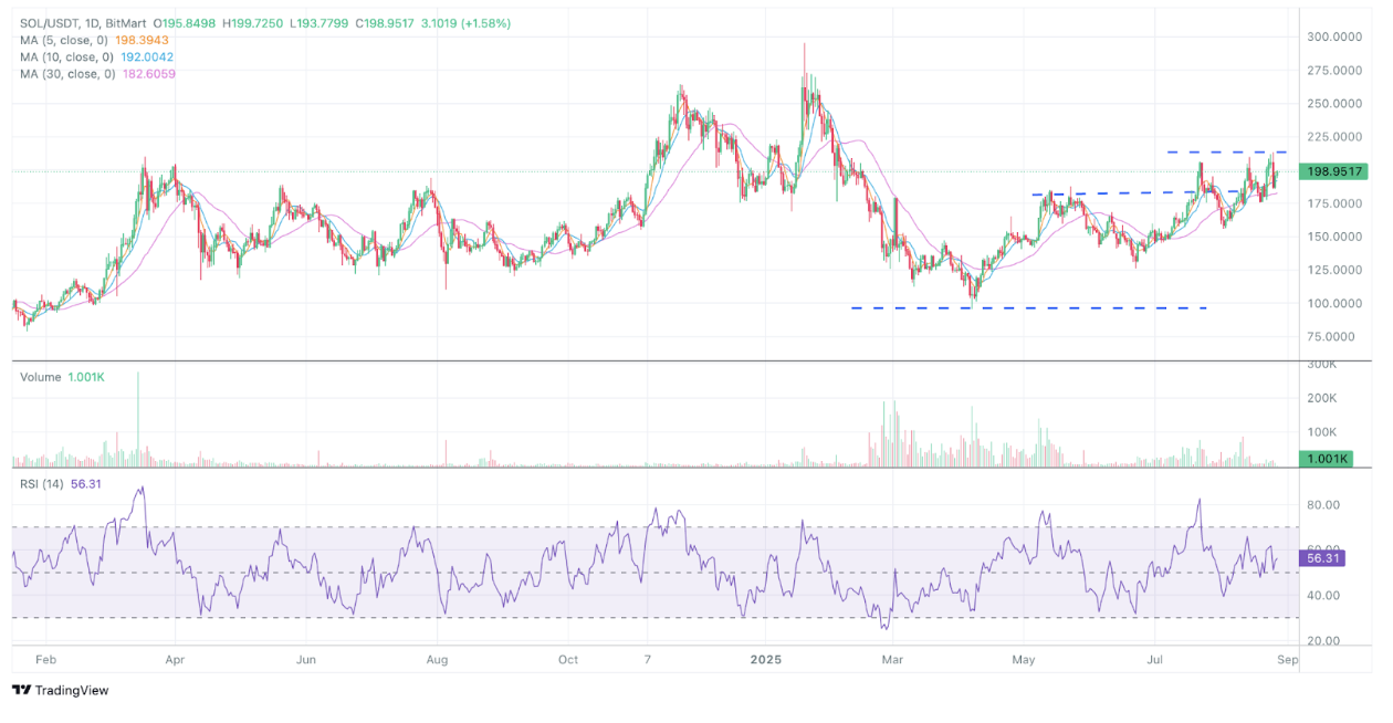比特币(BTC)徘徊在 110,530 美元关键支撑下方,空头压力仍重,若失守或下探至 105,000–100,000 美元;反之若突破 117,500 美元,则可能进入宽幅区间整固。以太坊(ETH)在创下 4,956 美元新高后回落至 4,424 美元,关键支撑位在 4,349 美元,若反弹则有望上攻 5,000–5,500 美元,同时机构资金持续流入凸显资金偏好转向 ETH。Solana(SOL)在 188 美元附近整固,价格形态呈上升三角形,突破 210 美元或开启新一轮上涨至 240–265 美元,但若跌破趋势线则可能回调至 155 美元。