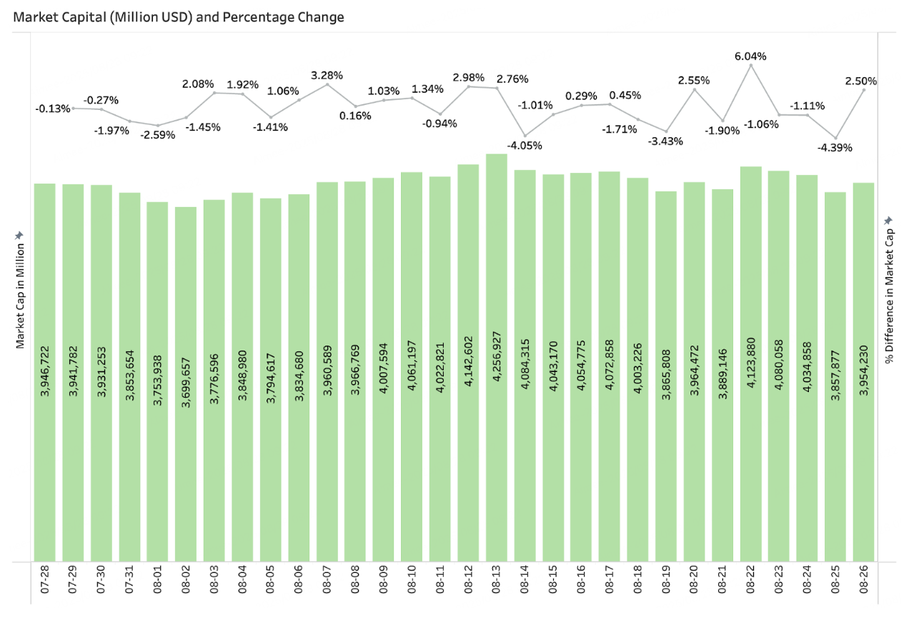 据 CoinGecko 数据,截止8月26日,加密货币总市值为3.95万亿美元,较上月下滑1.73%,整体在4万亿美元上下波动。8月期间,BTC市占率下降至57.5%,ETH市占率上升至14.1%,ETH/BTC汇率持续上涨至0.40,ETH表现依旧强劲。月内总市值自7月底的3.85万亿美元继续下探,于8月2日触及月内低点3.69万亿美元;随后资金回流推动市场快速反弹,并在8月13日达到阶段高点4.25万亿美元,较低点反弹幅度约15%。然而,高位未能形成有效突破,在宏观因素影响下,市场进入震荡整理阶段,8月下旬市值波动加剧。整体来看,8月市值虽较月初有所回升,但受宏观因素驱动明显,上行动能不足,高位承压明显,市场信心依旧偏谨慎。