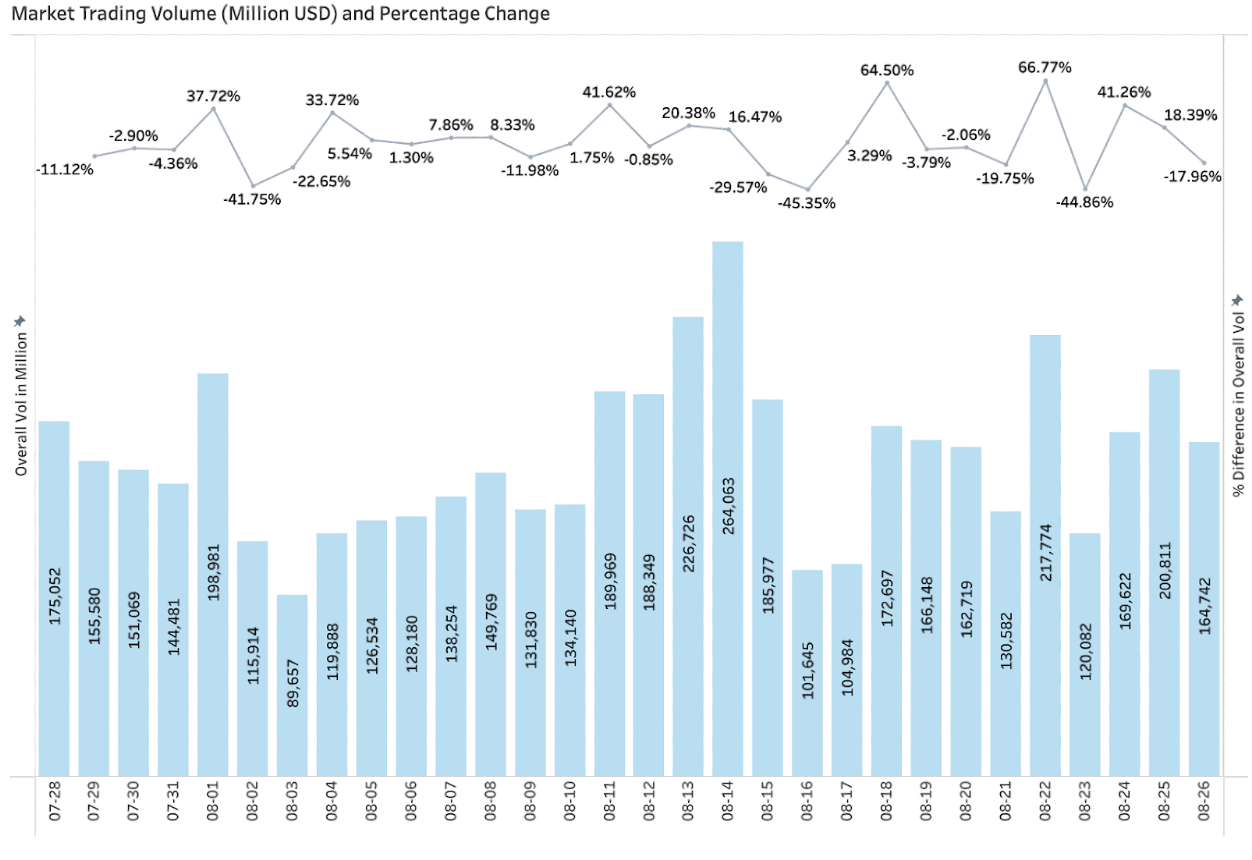 据CoinGecko数据,截至8月26日,8月加密市场交易量呈现显著波动,月内日均交易量约为1575亿美元,较上一周期小幅上涨0.38%。8月14日PPI数据公布后,市场避险情绪升温,成交量急剧放大并触及本月峰值2.64亿美元,随后快速回落,8月16-21日期间维持在1.0-1.6亿美元区间。8月22日,美联储主席鲍威尔在讲话中释放鸽派信号,降息概率提升支撑盘面,加密资产情绪得到提振,交易量重新回升至2亿美元以上,但整体仍伴随大幅波动。总体来看,8月加密市场活跃度显著受宏观事件驱动,资金进出节奏加快,延续高波动与高不确定性的特征。