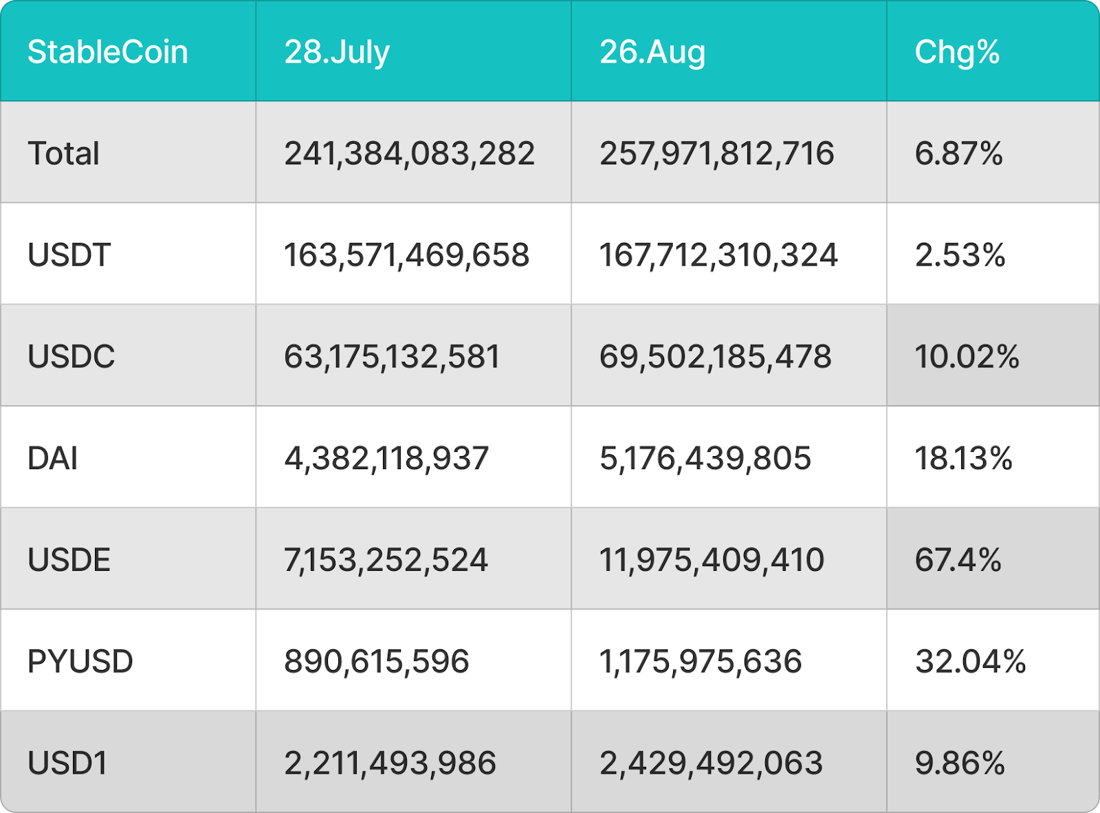 8月稳定币总流通量激增165.8亿美元,USDC单月涨幅10.02%