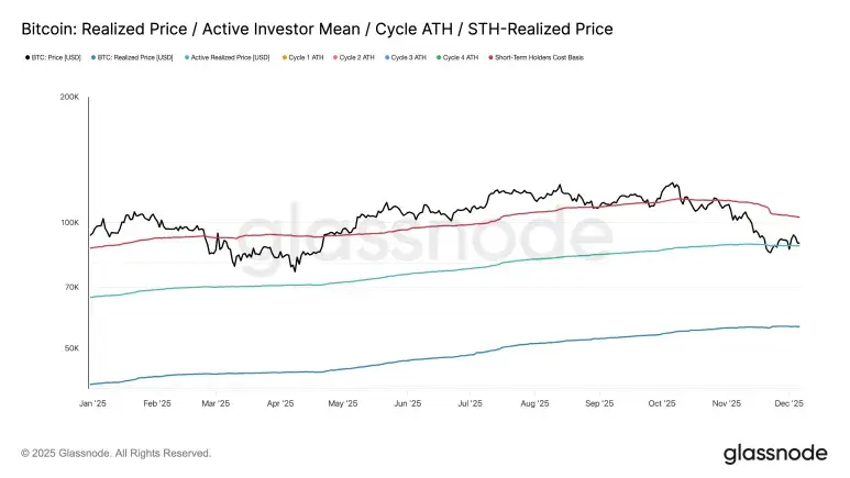 同时,观察短期持有者成本线与活跃实现价格线的关系。如果短期线向下穿过活跃线,风险会迅速增加。目前,这种不利的交叉现象尚未发生。