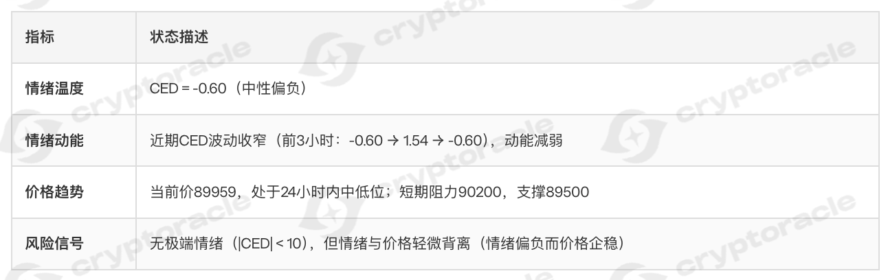 - 短期预期中性:当前情绪动能不足,价格或延续89500–90200区间震荡,需突破情绪背离区间方可确立方向。