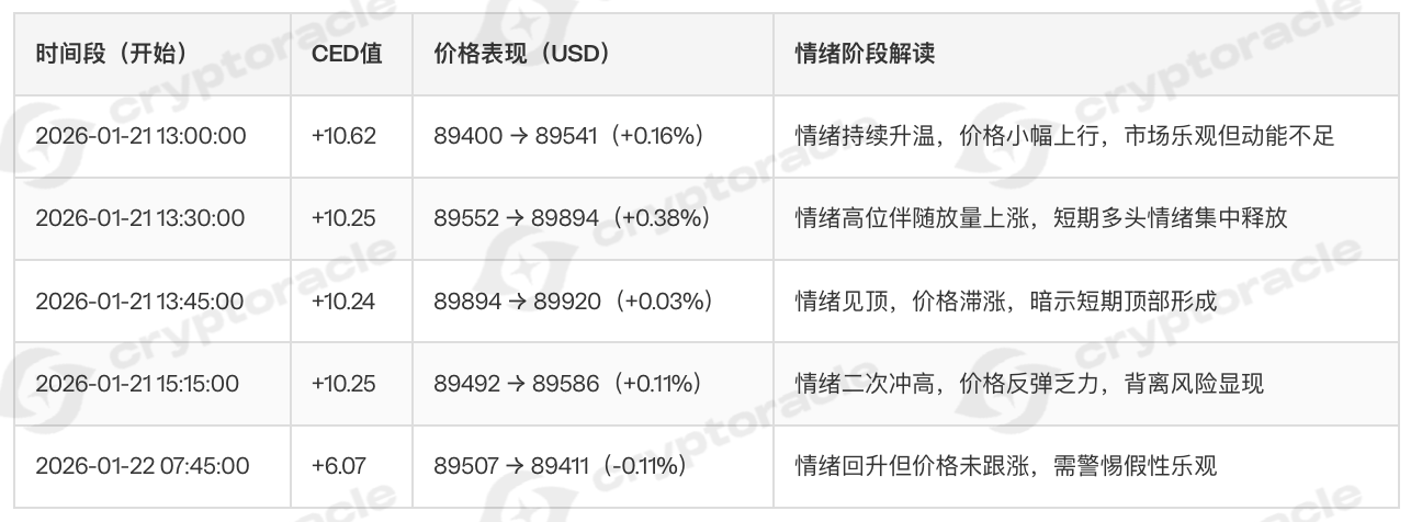 - 午后(12:00–18:00):情绪高位震荡后回落(CED从+9.66降至+0.17),价格同步回调。