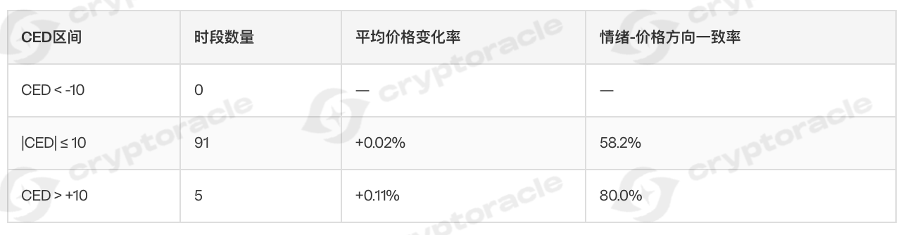 - 中性区间(|CED| ≤ 10)价格波动平缓,一致率偏低,反映情绪驱动力减弱。