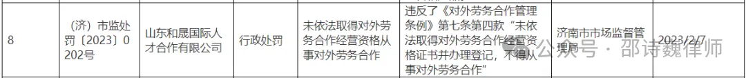 例如,根据济南市市场监督管理局公布的行政执法信息,山东某人才合作有限公司在未取得对外劳务合作经营资格证书的情况下,为有意出国劳务的人员提供中介服务,收取费用,受到行政处罚。