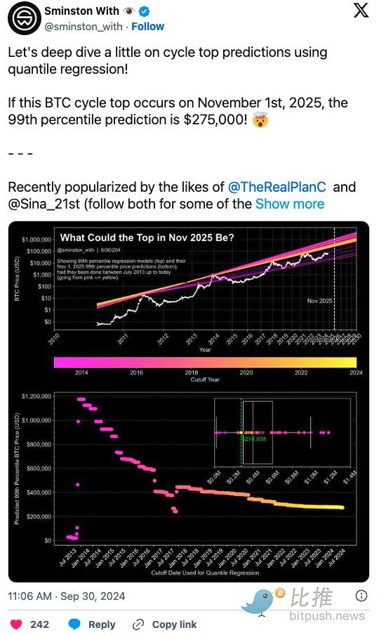 比特币研究员Sminston With运用分位数回归预测了周期顶部,他认为该顶部将于2025年11月1日到来,届时比特币价格将达到27.5万美元。