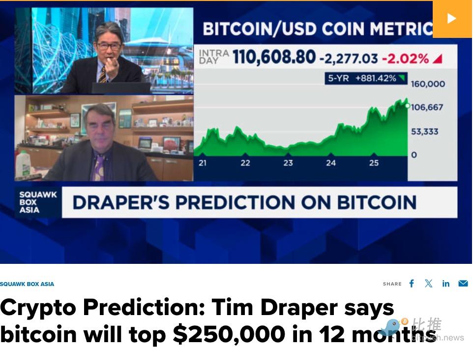 作为特斯拉、Skype、百度和Twitch等公司的早期投资者。Draper 此前曾预测比特币将在 2022 年达到这一价格,之后将预测时间修正为 2025 年。