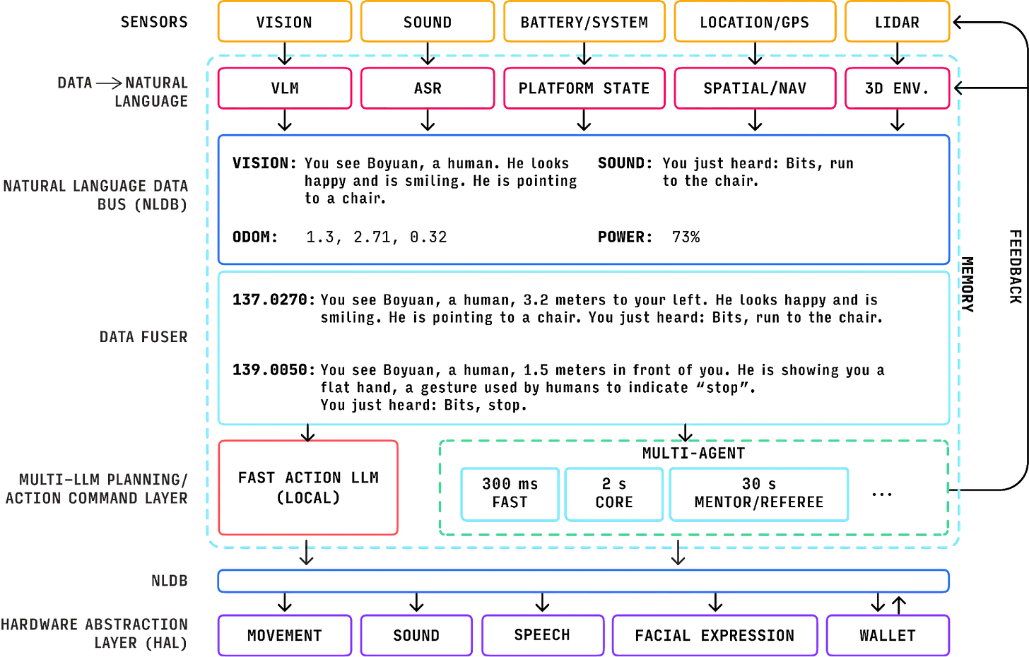 转换后的句子通过自然语言数据总线汇集。数据融合器将这些信息编织成一份情况报告,并传递给多个LLM。LLM通过这份报告分析情况,并决定机器人的下一步行动。