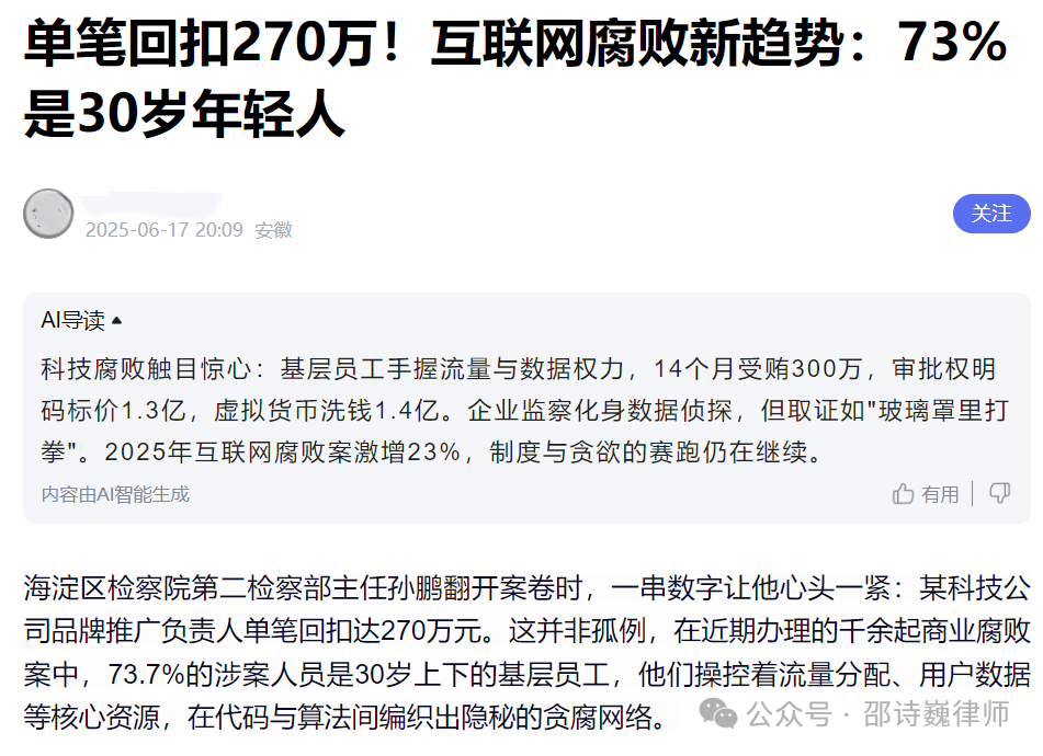 2025年5月,海淀区人民检察院发布《反商业腐败检察工作白皮书(2020—2024)》。白皮书显示,互联网领域腐败案件在 2025 年同比上升 23%,且涉案群体呈现更年轻化趋势,73% 为 30 岁左右的从业者。