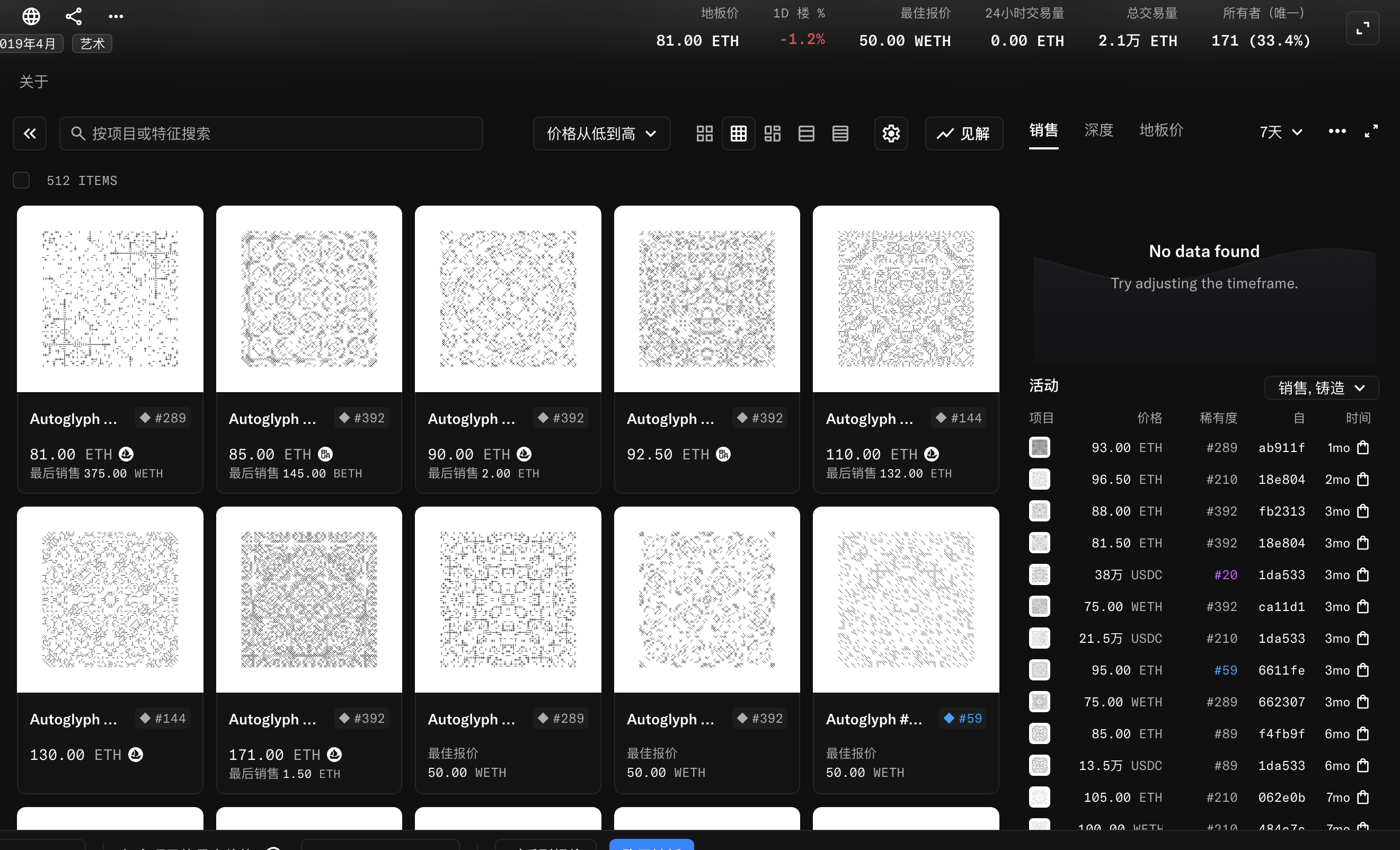另外还有总量为512个的生成艺术系列Autoglyphs,地板价在80 ETH左右,算是大家公认的第一个链上生成艺术,人们心中的圣杯。目前总交易量有2.1万 ETH。
