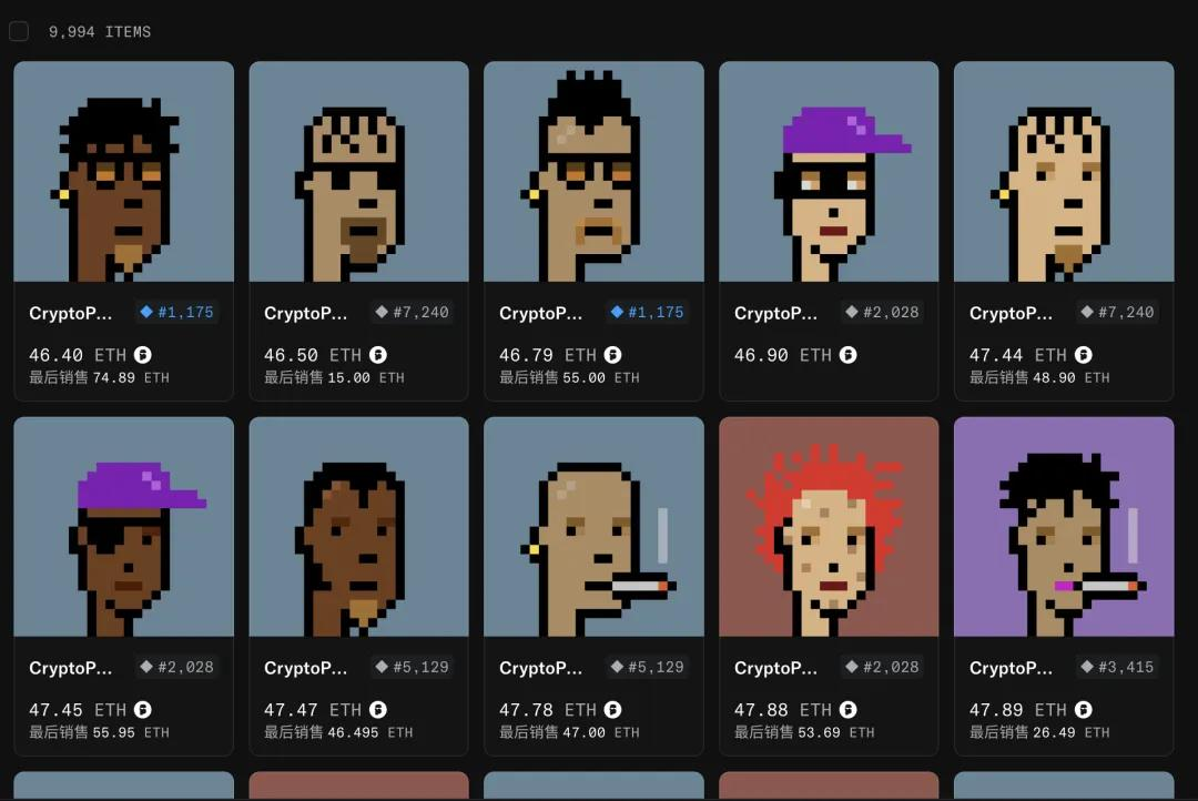 现在最便宜的加密朋克也要46.7 ETH,折合人民币130多万。要知道,当初这朋克可是免费领的。这个系列影响力比无聊猿还大,地位长期处在No.1。
