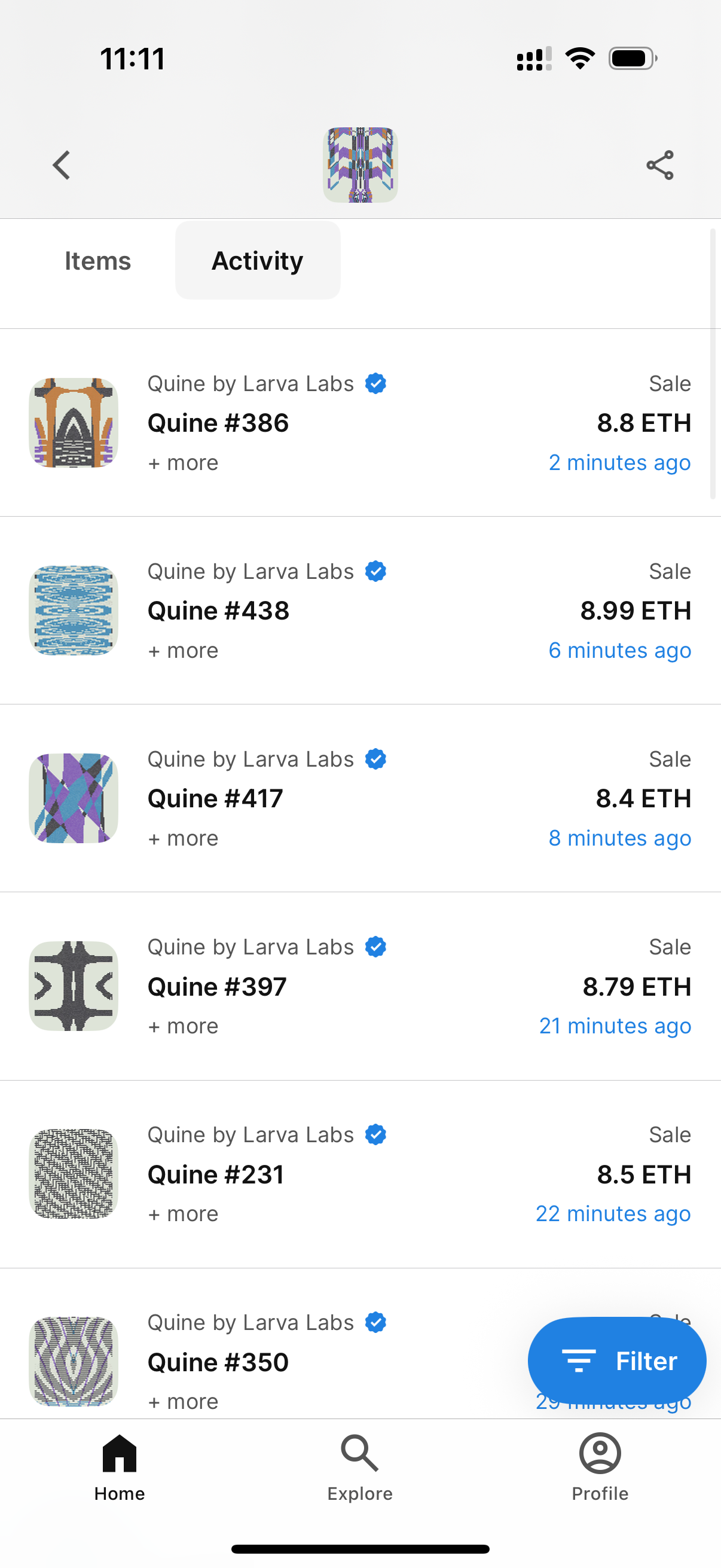 我买的生成艺术作品,是一个NFT。系列名叫《Quine by Larva Labs》。