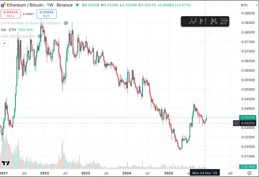在过去ETH的空头中有重要的一部分来自传统的 Long BTC/Short ETH 配对交易,尤其这个配对在过去熊市里一般表现非常好,但是这次发生了意外。ETH/BTC 比率从11月开始一直保持横盘抵抗态势。