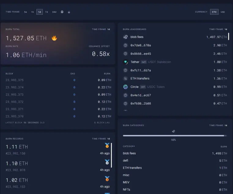 (2) Dencun(双维 + blob 市场独立):烧执行层 + blob,L2 数据写入 blob 也会烧 ETH,但在低需求时,blob 部分几乎为 0。