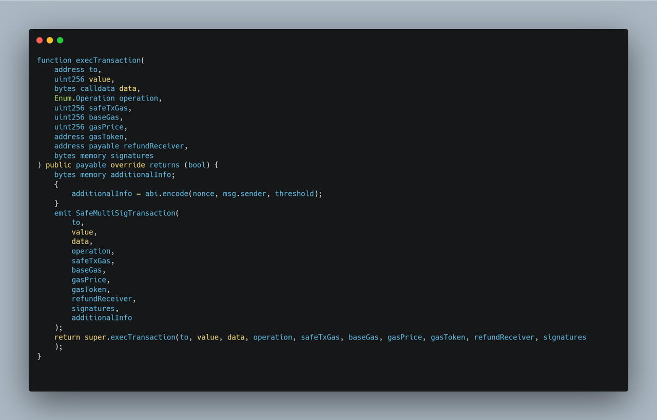 攻击者首先调用Gnosis Safe Proxy合约中的execTransaction函数。该函数成为恶意移除多签成员的入口,后续所有恶意操作均在此次交易的内部被执行。