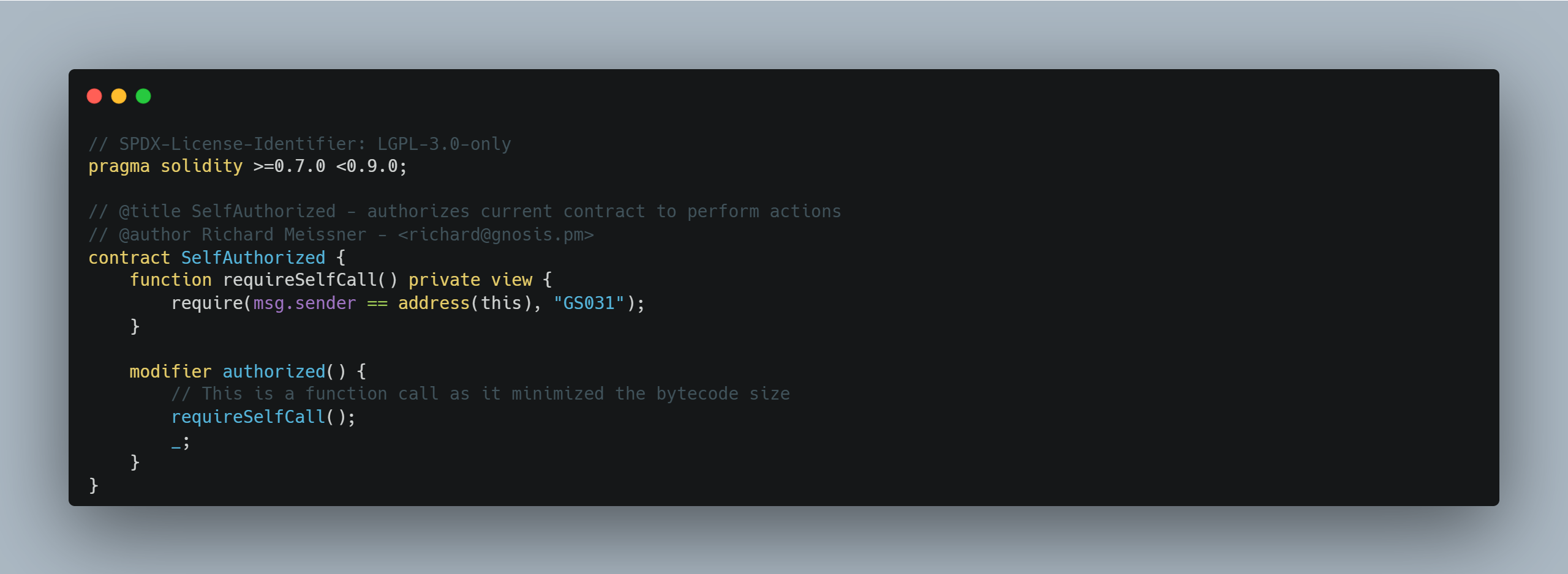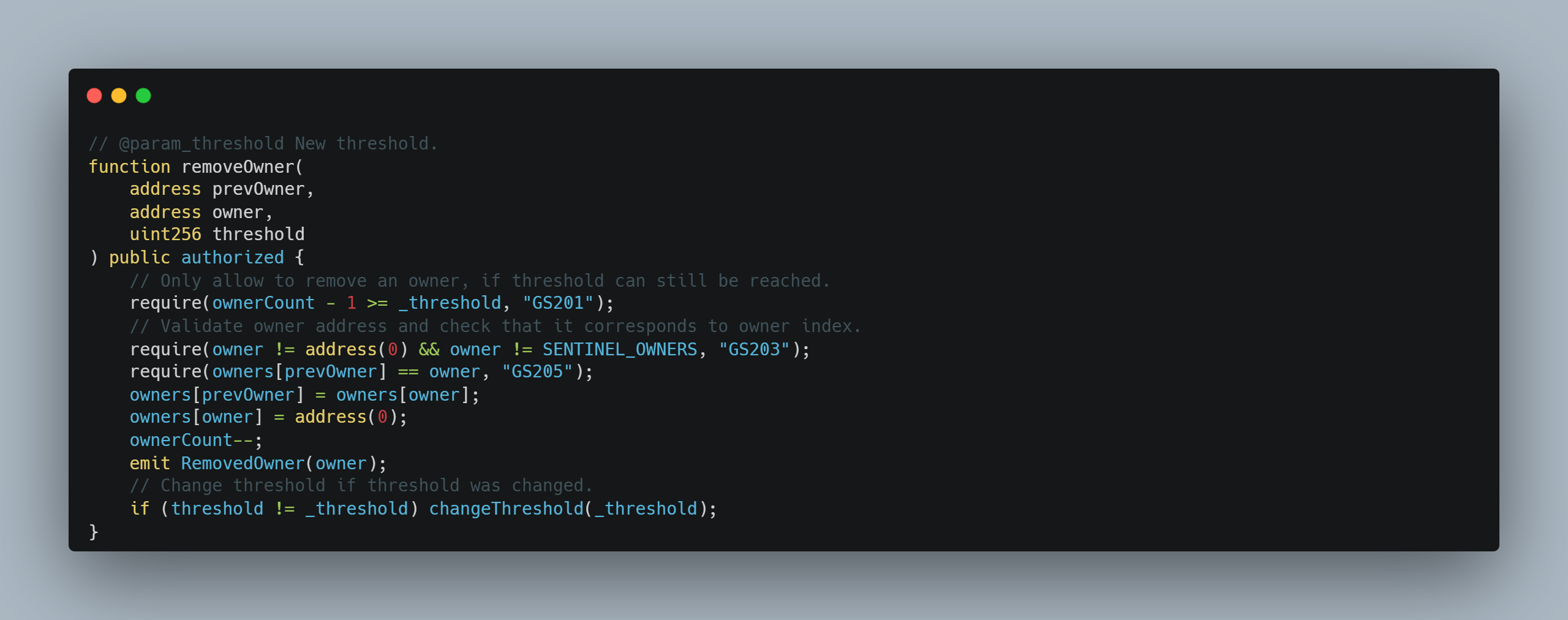 调用能够成功的核心在于满足条件msg.sender == address(this)。在removeOwner函数中,为了防止外部直接调用,合约设置了authorized验证,其内部逻辑通常要求调用者必须是合约自身 (msg.sender == address(this))。因此,只有当合约内部流程回调自身时,removeOwner才会被成功执行。