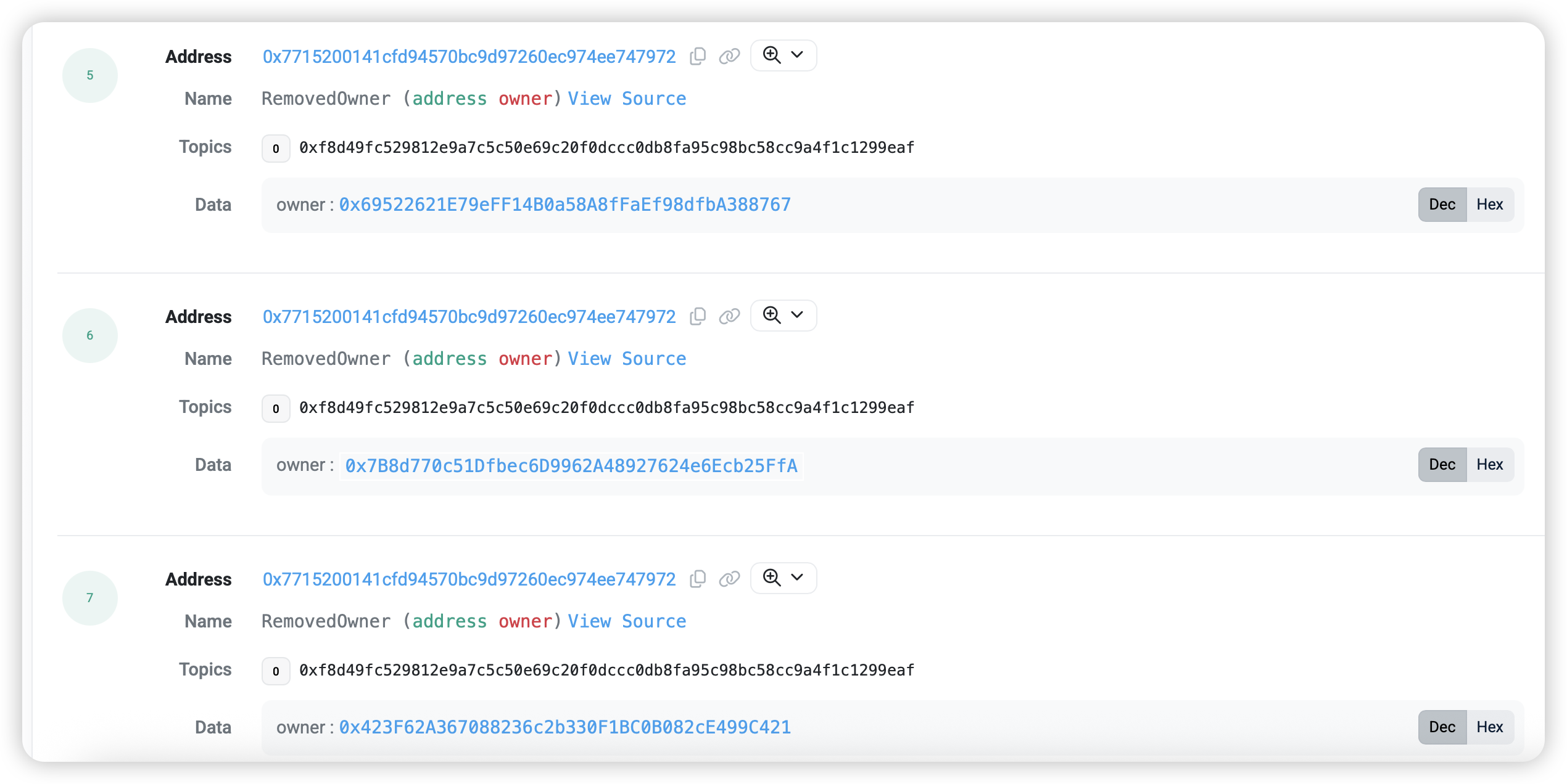 黑客通过上述手法逐一删除多签中的其他Owner,破坏多签机制并最终接管合约。