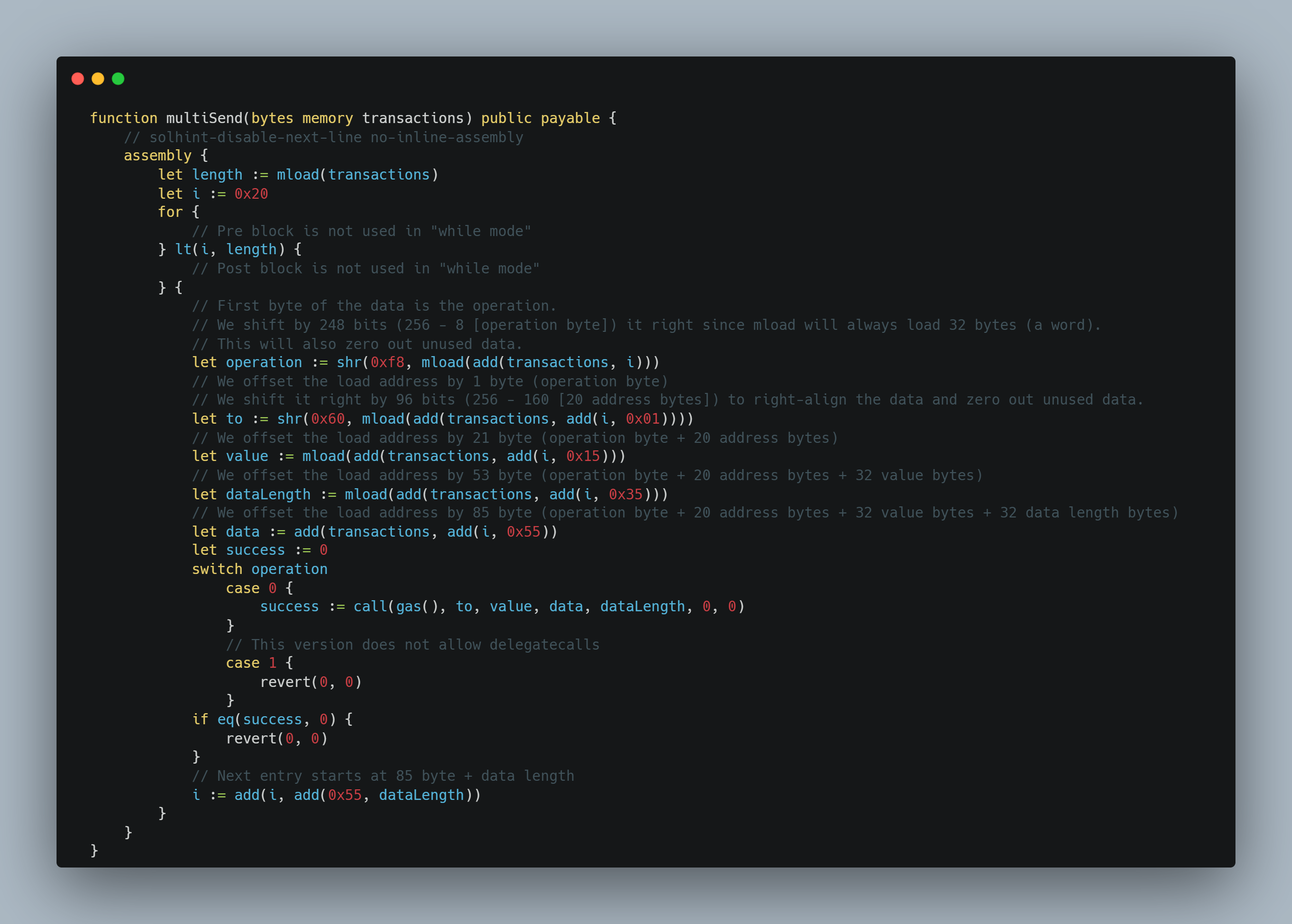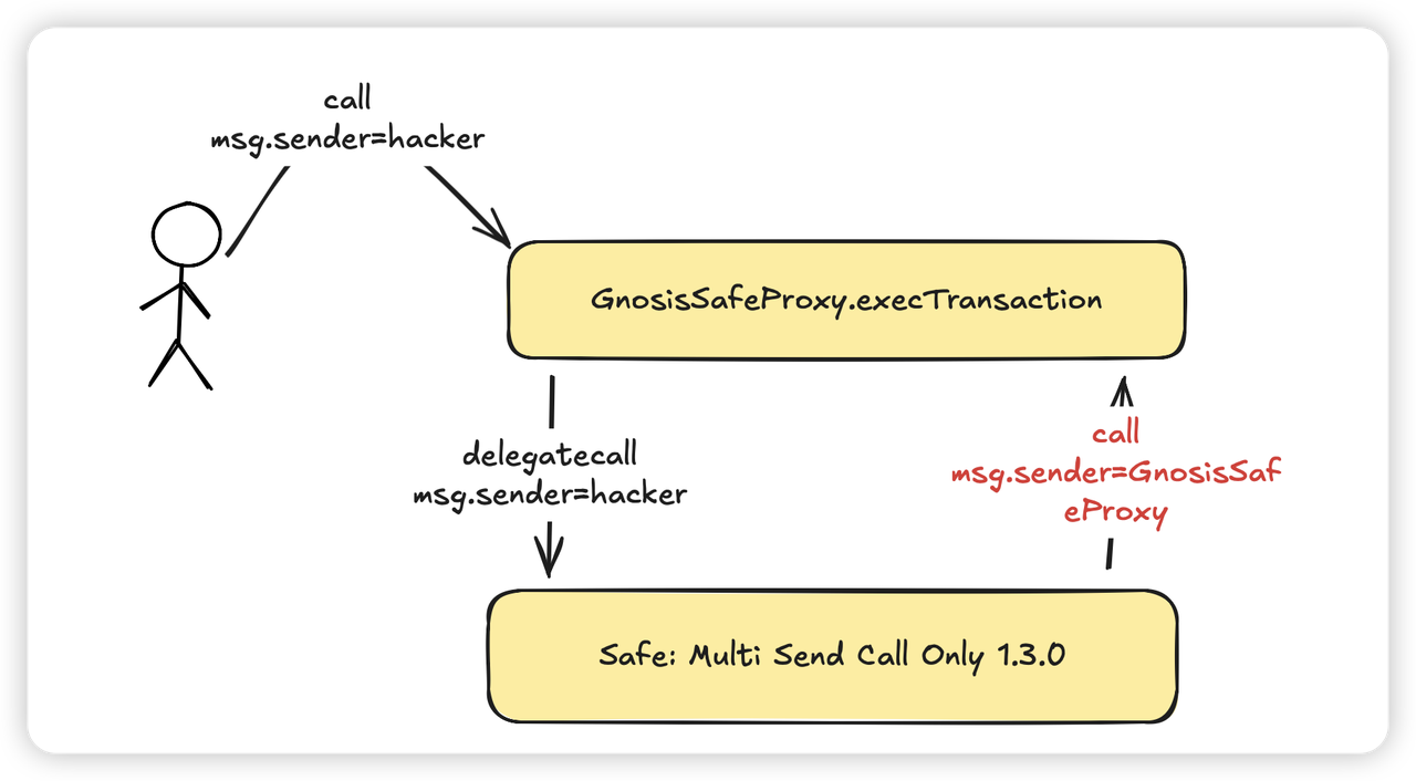 在调用execTransaction时,攻击者在其data参数中指定了一个恶意操作:通过delegatecall方式调用Safe: Multi Send Call Only 1.3.0实现合约。