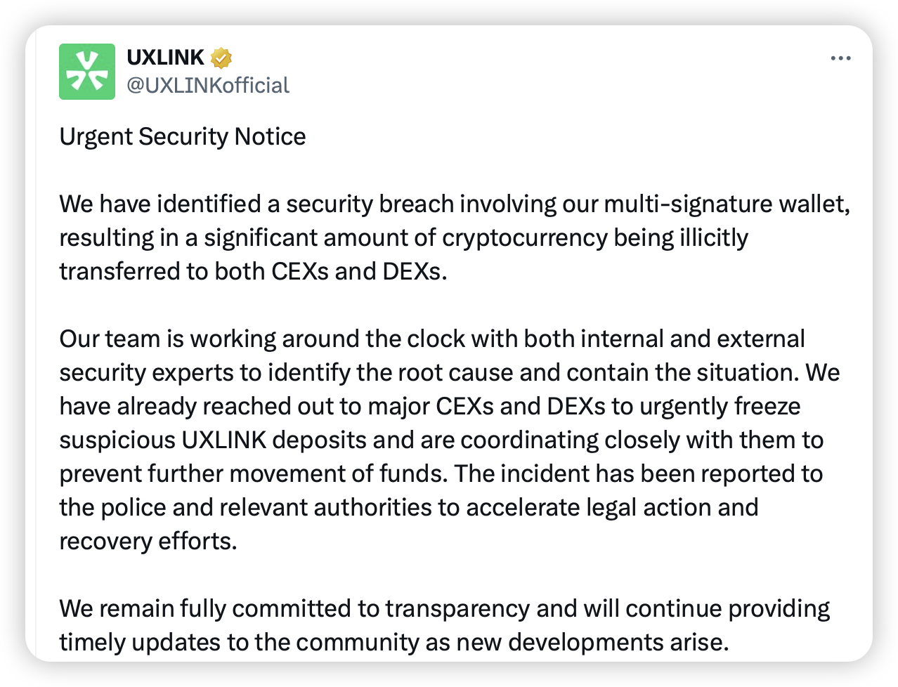 9月23日,UXLINK项目多签名钱包私钥泄漏,导致约1130万美元资产的加密货币被盗取,并已被分散转移至多个中心化(CEX)和去中心化(DEX)交易所。在被攻击的第一时间,我们与UXLINK一起调查分析这起攻击以及监控了资金流动。UXLINK紧急联系各大交易所请求冻结可疑资金,已向警方及相关机构报案以寻求法律支持和资产追回,黑客的大部分资产已被各大交易所标记冻结,从而最大程度地降低了社区面临的进一步风险。项目方承诺将对社区保持透明,ExVul也将持续分析跟进事件进展。