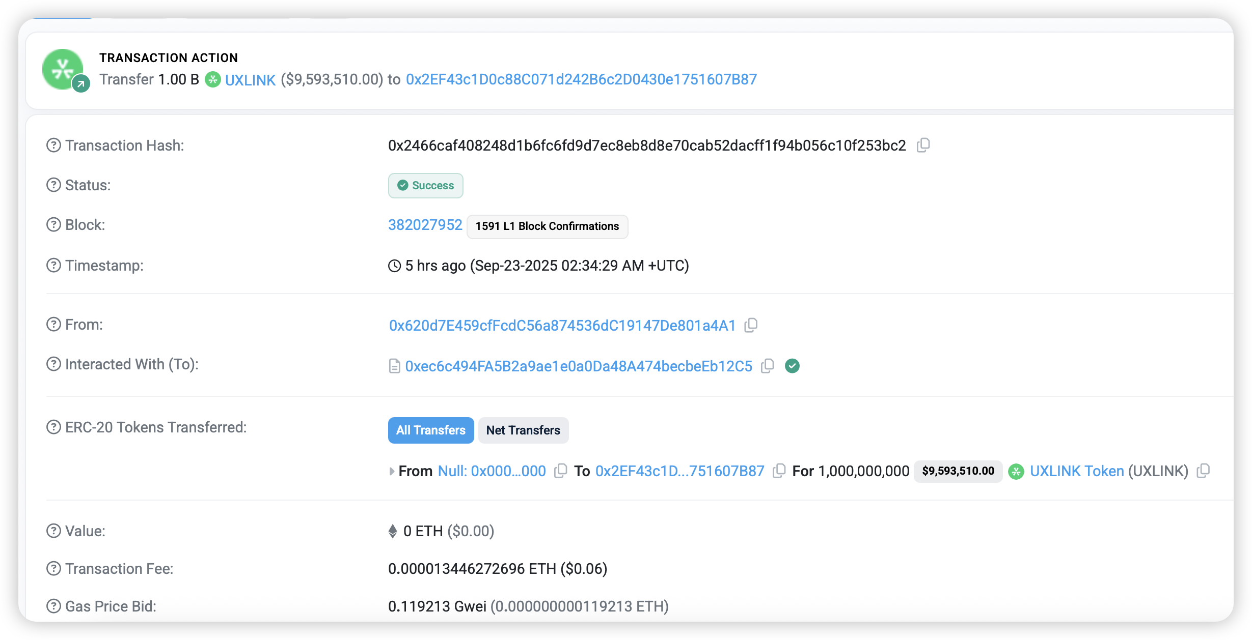 未经授权的1B $UXLINK铸币: https://arbiscan.io/tx/0x2466caf408248d1b6fc6fd9d7ec8eb8d8e70cab52dacff1f94b056c10f253bc2