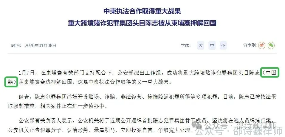 2026年1月7日,据国内官方报道,在jpz有关部门支持配合下,我国成功将重大跨境赌诈犯罪集团头目c某(中国籍)从jpz金边押解回国。