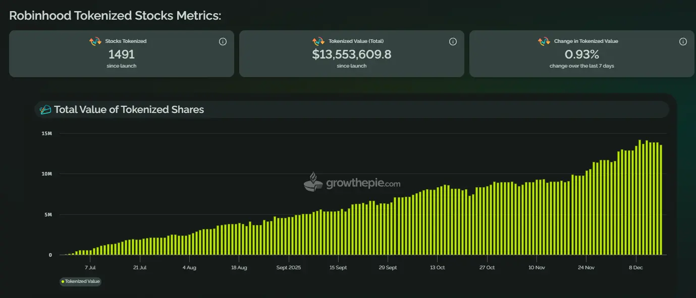 截止至目前,Robinhood已将1,491种股票进行了代币化,代币化股票的总市值已达到约 1,355万美元。在最近7天内,代币化总价值的变化为 0.93% 的增长。自股票代币化业务上线以来,代币化资产的总价值呈现出持续稳健的上升趋势,尤其在近期增长加速,表明市场对Robinhood的代币化股票产品需求持续增加。