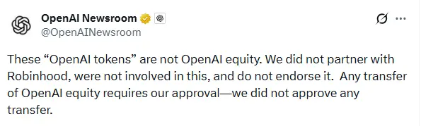需要注意的是,Robinhood 在股票代币化的尝试已引发监管争议。2025 年 6 月,Robinhood 在欧洲市场推出包括 OpenAI 在内的股票代币后,OpenAI 随即公开声明其未与 Robinhood 建立任何合作关系,亦未授权发行任何形式的代币化股权,并强调相关代币不代表 OpenAI 实际股权。在该声明发布后,监管机构也发表相关争议,Robinhood 随后对相关代币产品进行了下架处理。这表明Robinhood 当前的代币化业务仍过渡阶段,实际股权映射、发行授权及法律属性仍存在明显边界问题。