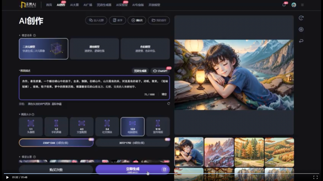李超用到的AI作画软件叫“无界AI”,输入描述画面的提示词,AI自动生成一张尺寸为16:9,分辨率为2304X1344的高清图片。