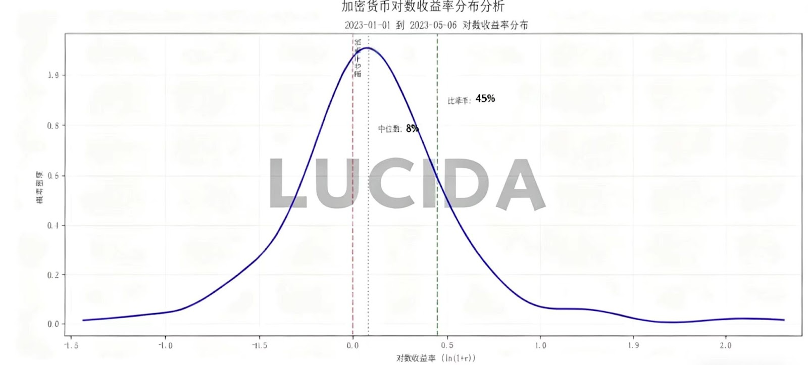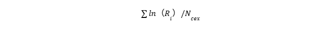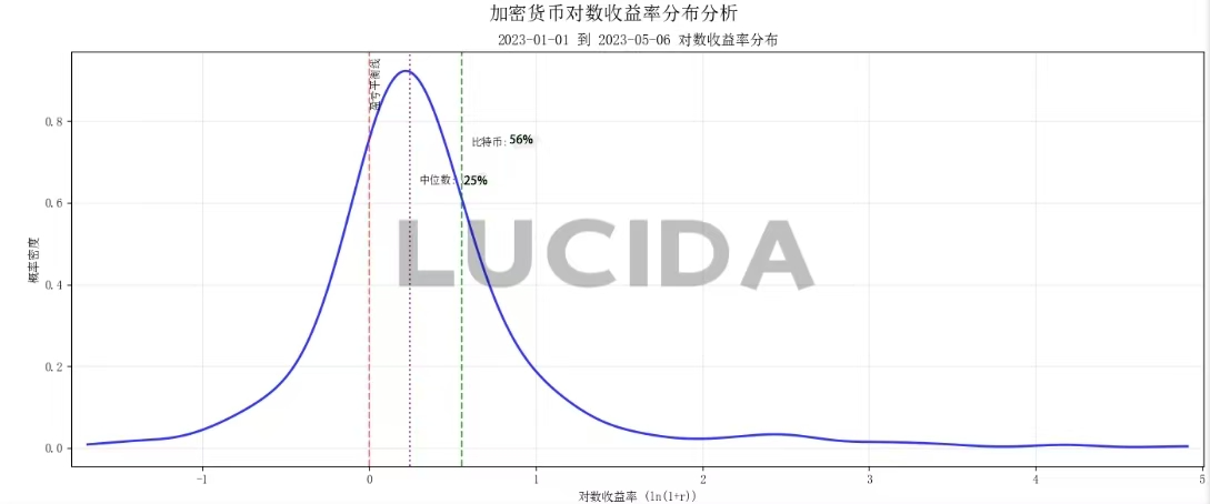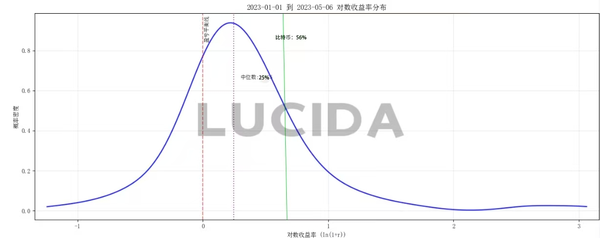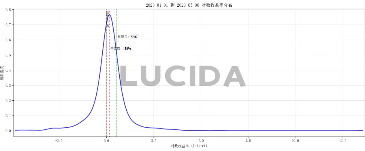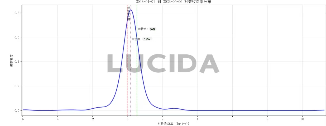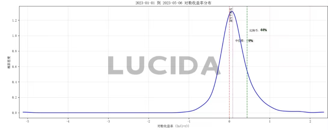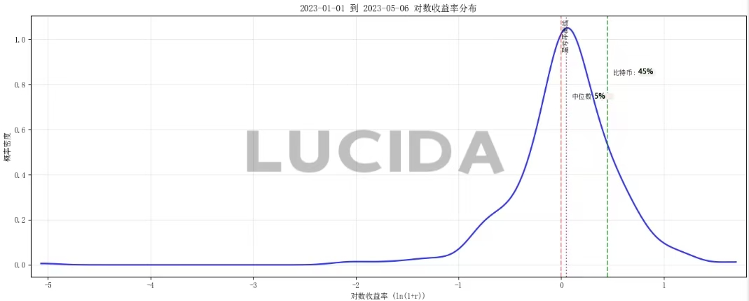 平均收益率能够很好的从宏观层面评价一个交易所内币种收益表现的指标。为避免普通收益率的非对称性(涨幅理论上无上限、跌幅有下限),LUCIDA转而使用对数收益率来描述币种分布。具体计算公式如下所示: