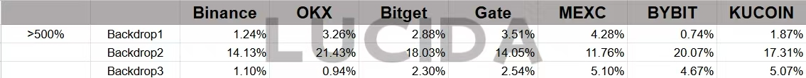 3.不同CEX涨幅超过500%的币种数量占该交易所上市总币种数量的比例