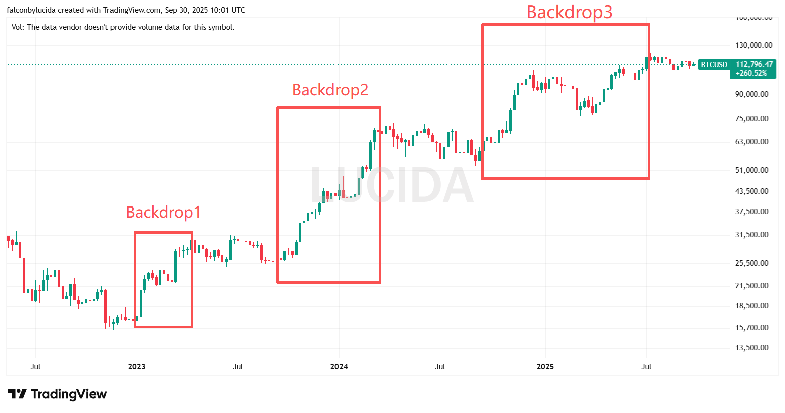 时间切片(Backdrops):为了减少行情阶段差异带来的扰动,LUCIDA把近两年Crypto牛市的核心上涨段划分为三段: