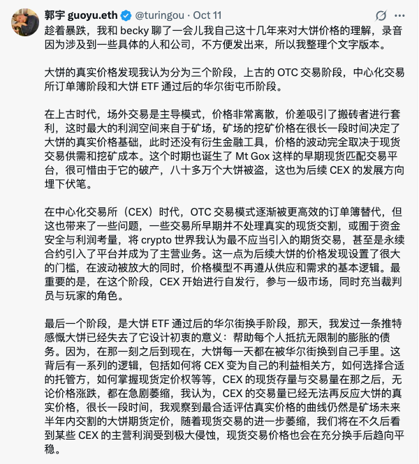 10月11日一场加密市场的大跌让郭宇再次在推特上系统阐述了他对这个行业长达十余年的观察。他系统阐述了他对比特币价格发现机制的理解,并将这个过程分为三个阶段。