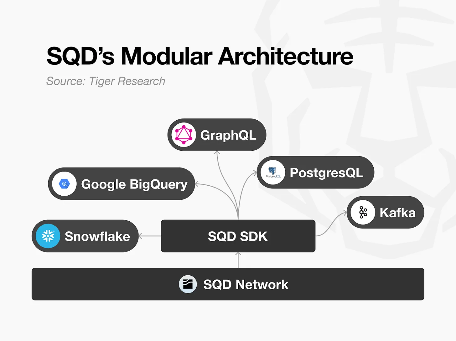 SQD 网络的另一个显著特征是其模块化结构。现有的索引解决方案采用单体结构,将数据收集、处理、存储和查询等所有环节都在单一系统中处理。这简化了初始设置,但限制了开发者选择数据处理方法或存储位置的自由度。