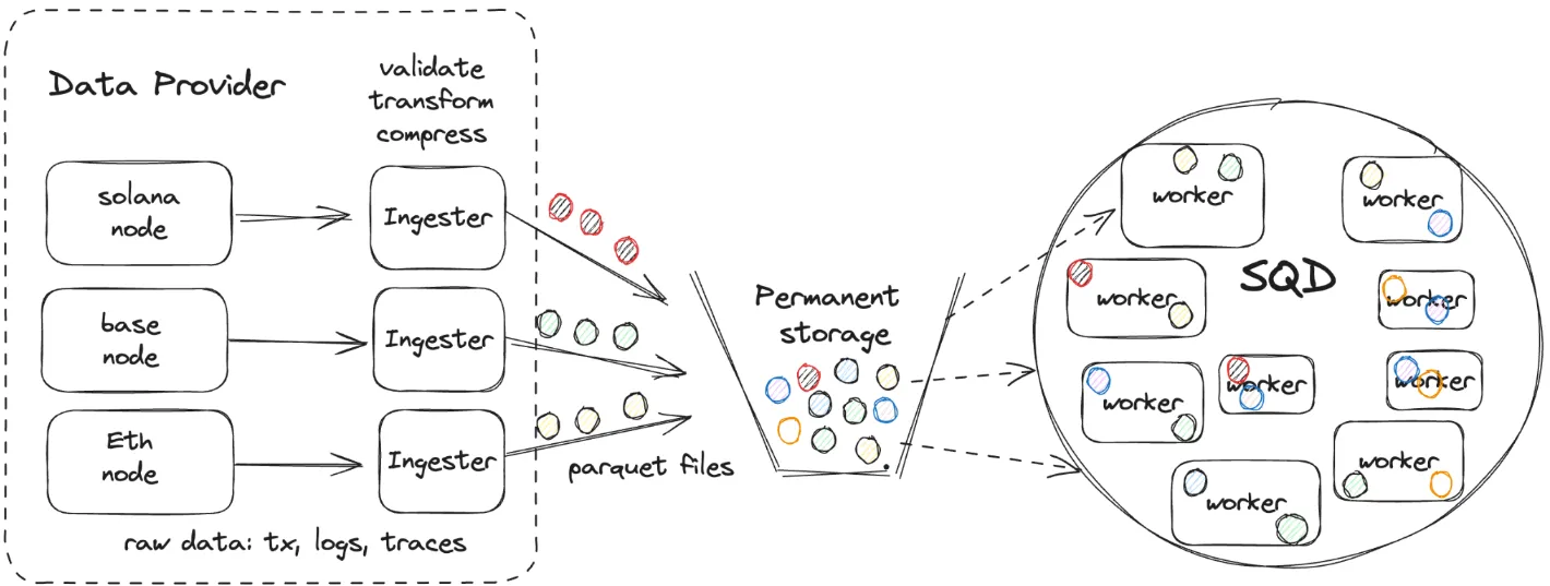 在初始引导阶段,数据提供商目前由 SQD 团队管理。此策略确保了初始数据质量和稳定性。随着网络的成熟,外部提供商将能够通过代币治理参与进来。这将使数据采购阶段完全去中心化。
