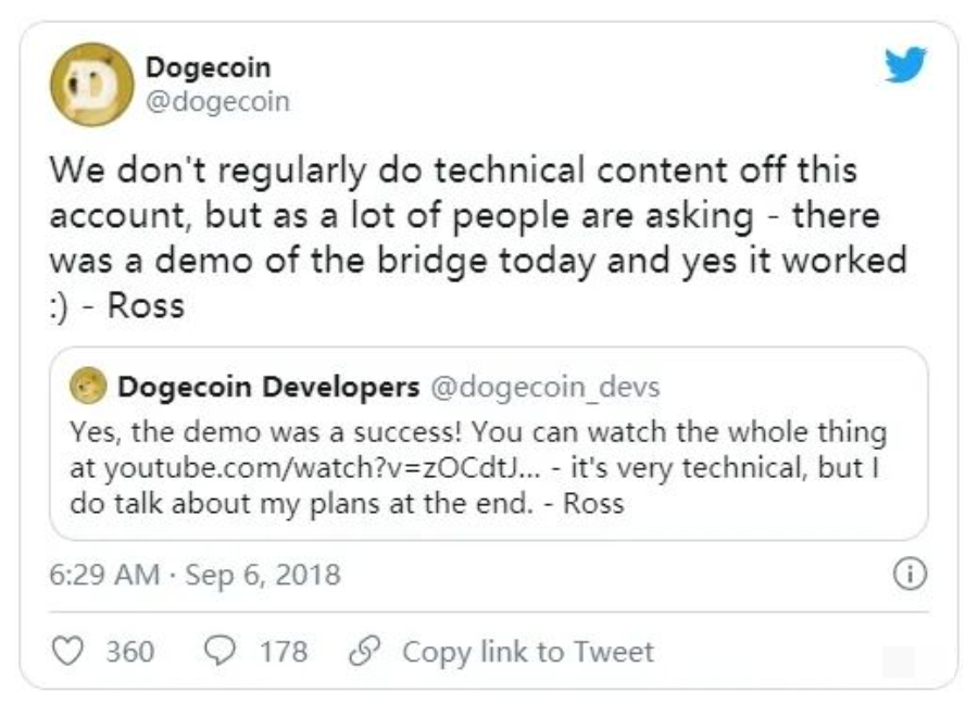 这个网桥被认为是一个新的更新,将允许两个区块链之间的互操作性。该公告重新激起了社区对该项目的支持,并且狗狗币的价格在48小时内上涨了173%。然而,后来得知,由于以太坊的价格暴跌,没有足够的资金继续开发这座桥,所以更新被搁置。从那以后,没有人提及狗狗币和以太坊之间的桥梁是否会继续下去。狗狗币价格也复原了。
