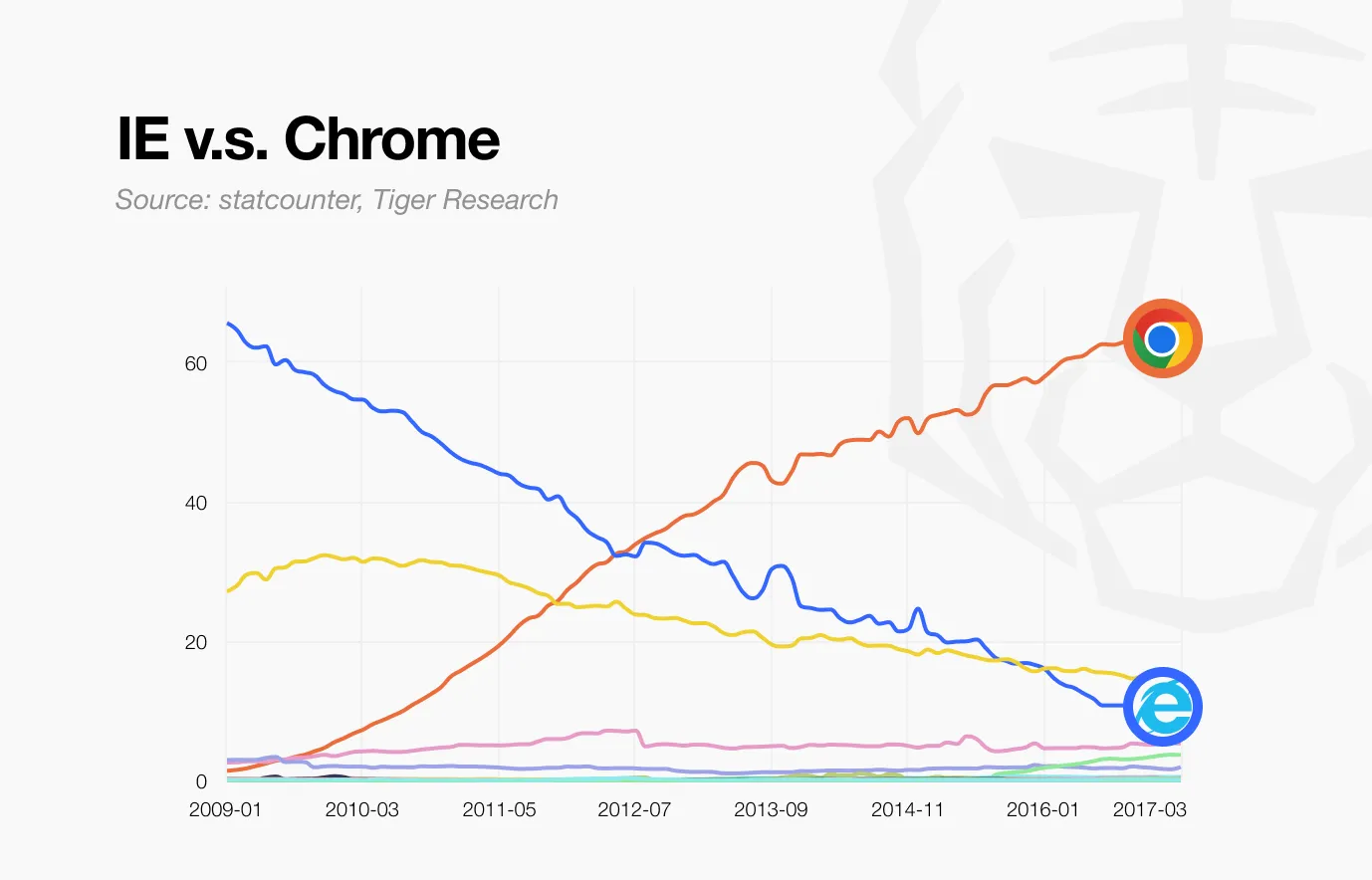 2008年,Google Chrome改变了一切。它提供了近十倍的速度提升,并采用多进程架构确保稳定性。自动更新增强了安全性。复杂技术被隐藏在浏览器背后,留给用户的是快速可靠的网络体验。五年内,Chrome超越IE成为全球领导者。