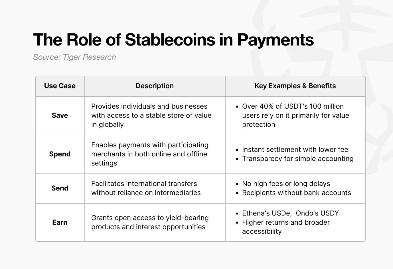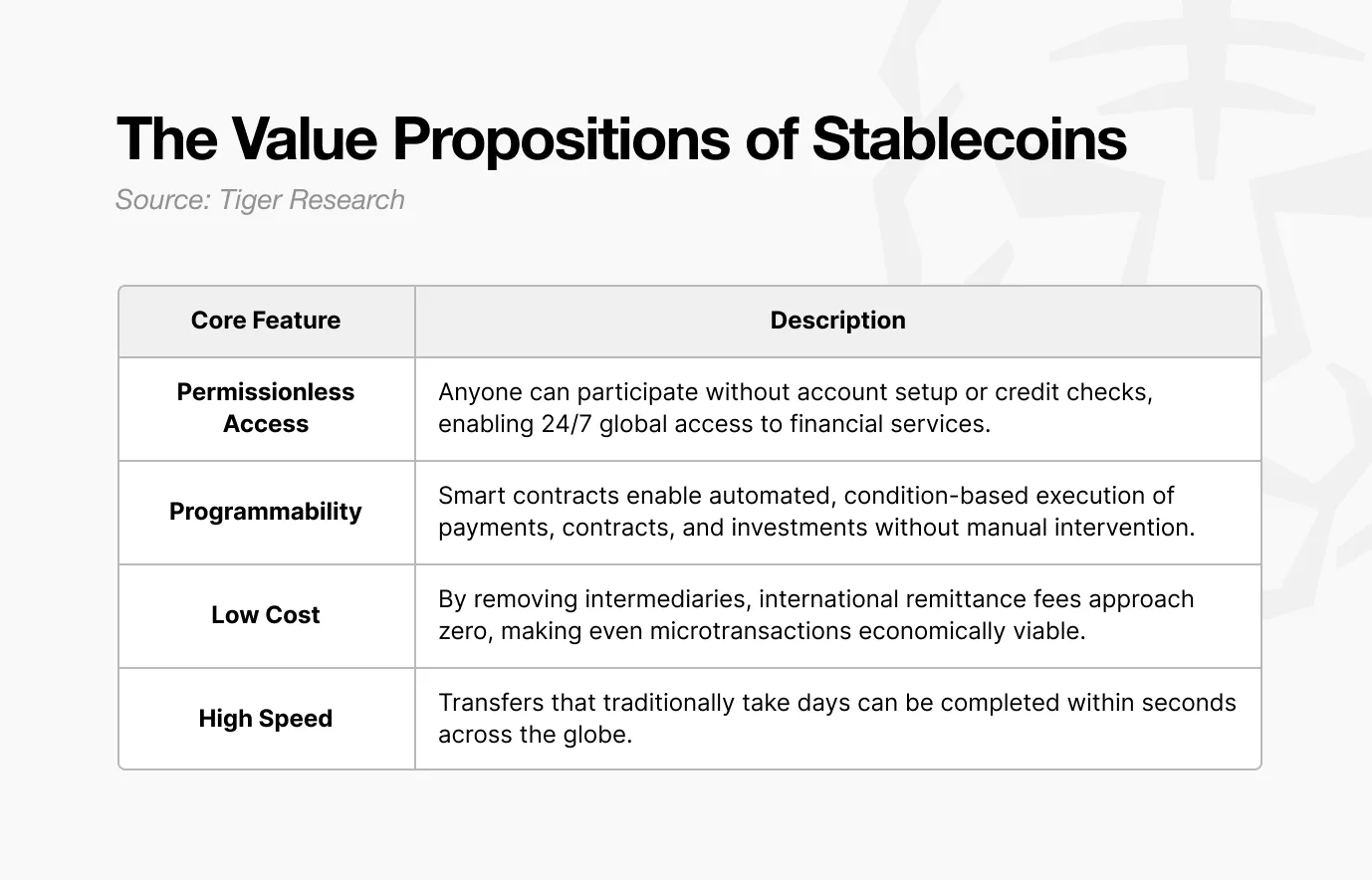 稳定币通过直接在区块链网络上连接用户来消除这些摩擦。无需审批或许可。只要存在互联网连接,即可随时随地即时转账。从功能上讲,这类似于实物现金的交接,但采用数字化、无国界的形态。