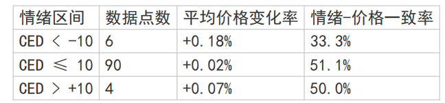 - 情绪温和区间(CED ≤ 10)价格表现最为平淡,方向一致性约50%