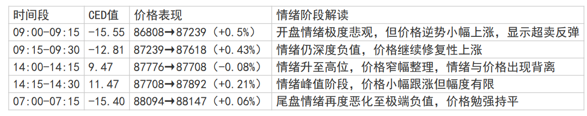 - 极端负情绪阶段(CED < -10)反而出现平均最高涨幅,显示悲观情绪往往对应价格反弹机会