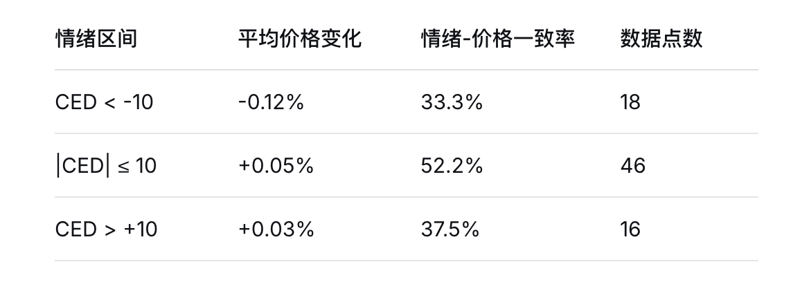 趋势结论:情绪极端化阶段往往对应价格反转,在CED<-10的极度悲观区间价格反而有33.3%的概率上涨。中性情绪区间价格表现相对稳定且情绪-价格一致率较高(52.2%)。恐慌情绪的影响大于乐观情绪,负面极端情绪期间的价格波动幅度明显大于正面极端情绪。
