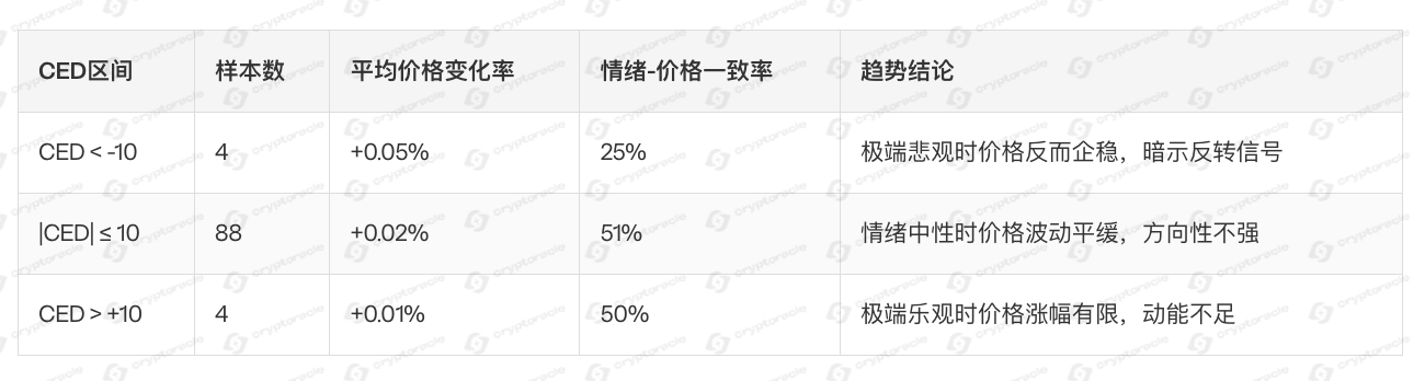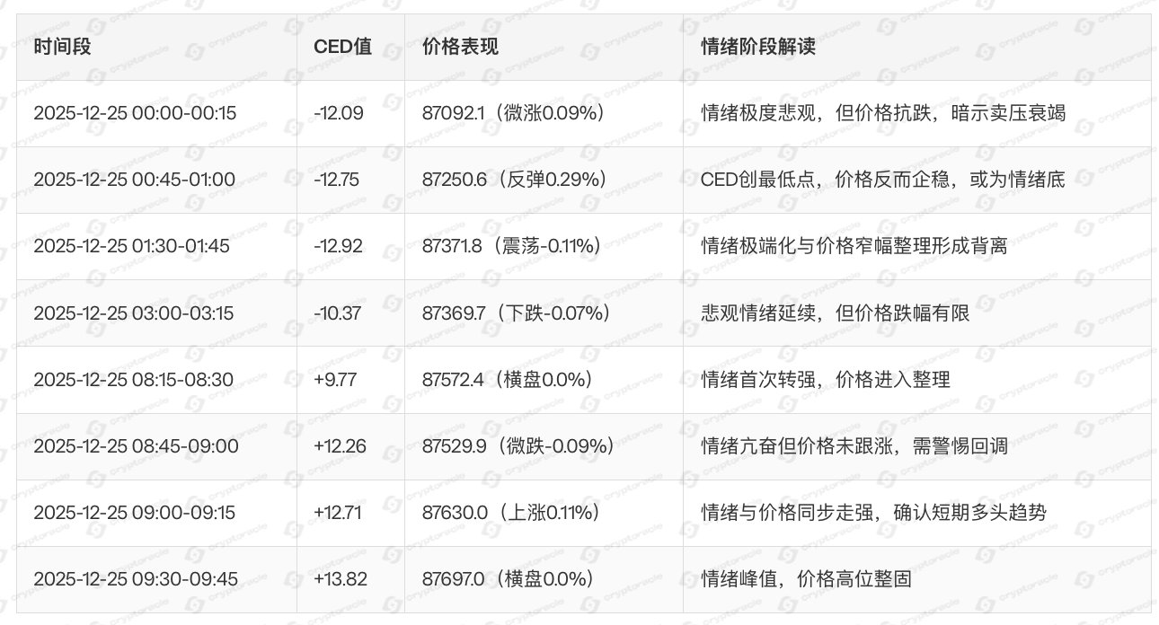 - 夜间至凌晨(20:00-04:00):情绪极端化(|CED|多次突破10),价格探底后企稳