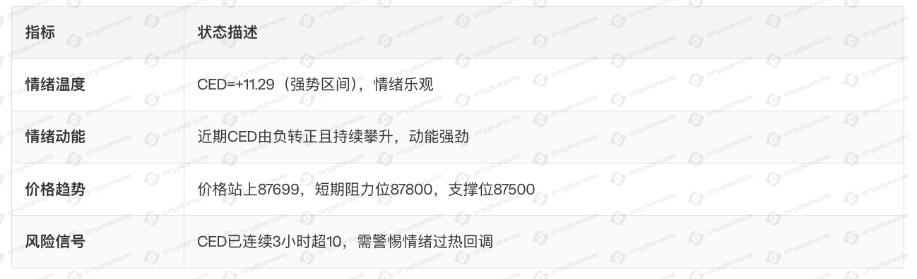 - 清晨至今(04:00-10:15):情绪快速转正并冲高,价格同步上行至87700一带