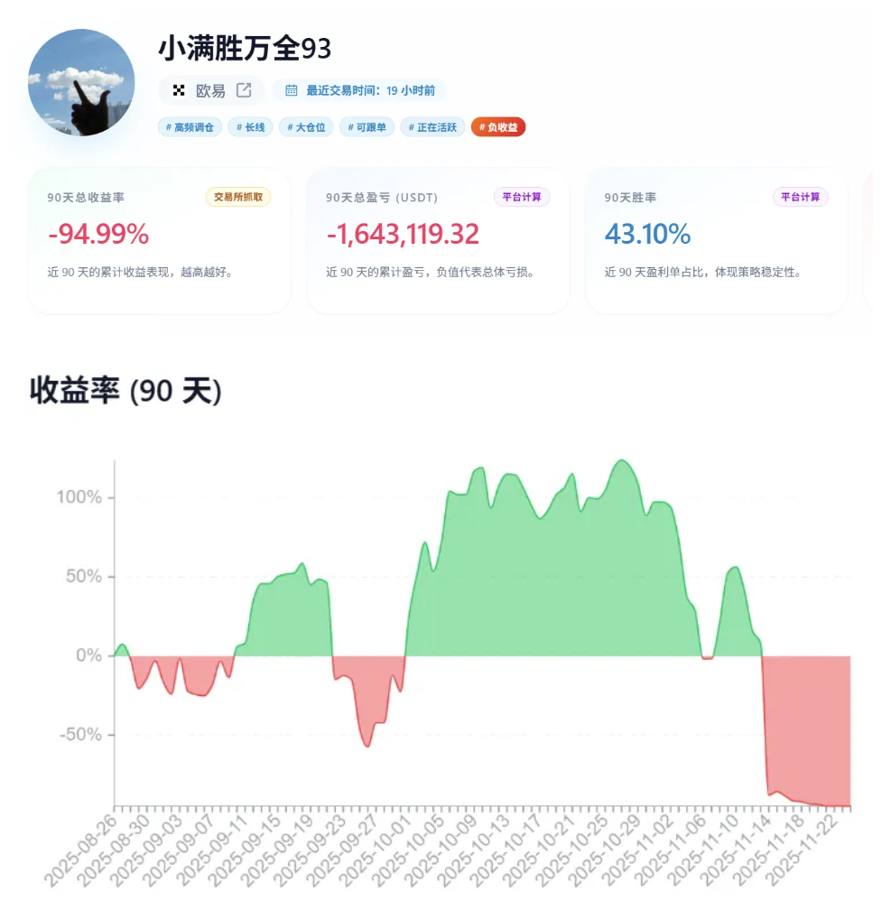 这是一个真实的金融悲剧。一位曾经的OKX平台推荐榜第一名带单员,拥有1,700名跟单者,在90天内从收益率+179%的巅峰跌落到-94.99%的接近完全归零。更令人震惊的是,根据最新数据显示,深夜交易累计亏损超过200万USDT,占总亏损的60%以上。这不仅是一个交易失败的故事,更是一个关于人性、情绪失控和风险管理崩溃的完整案例。