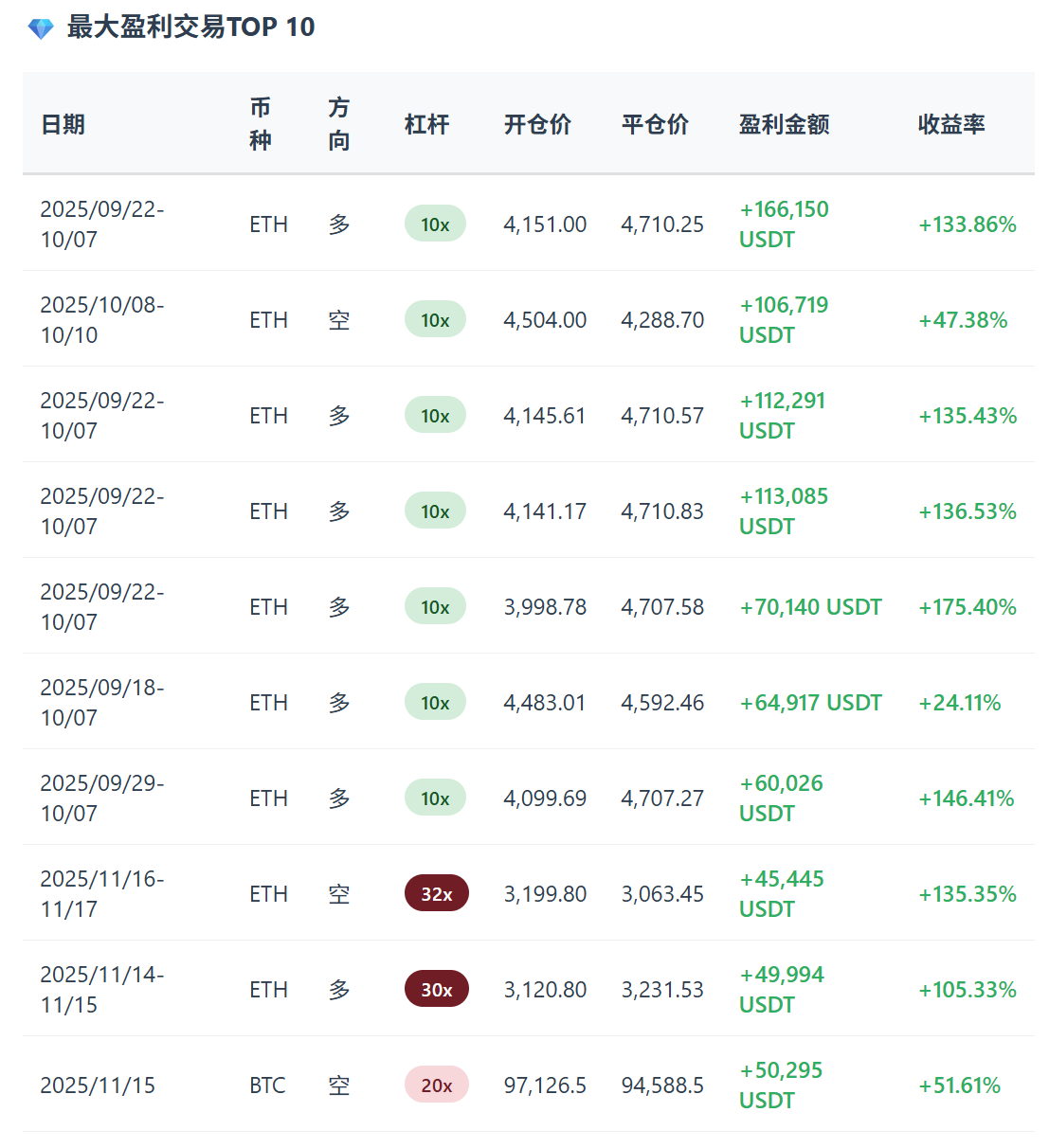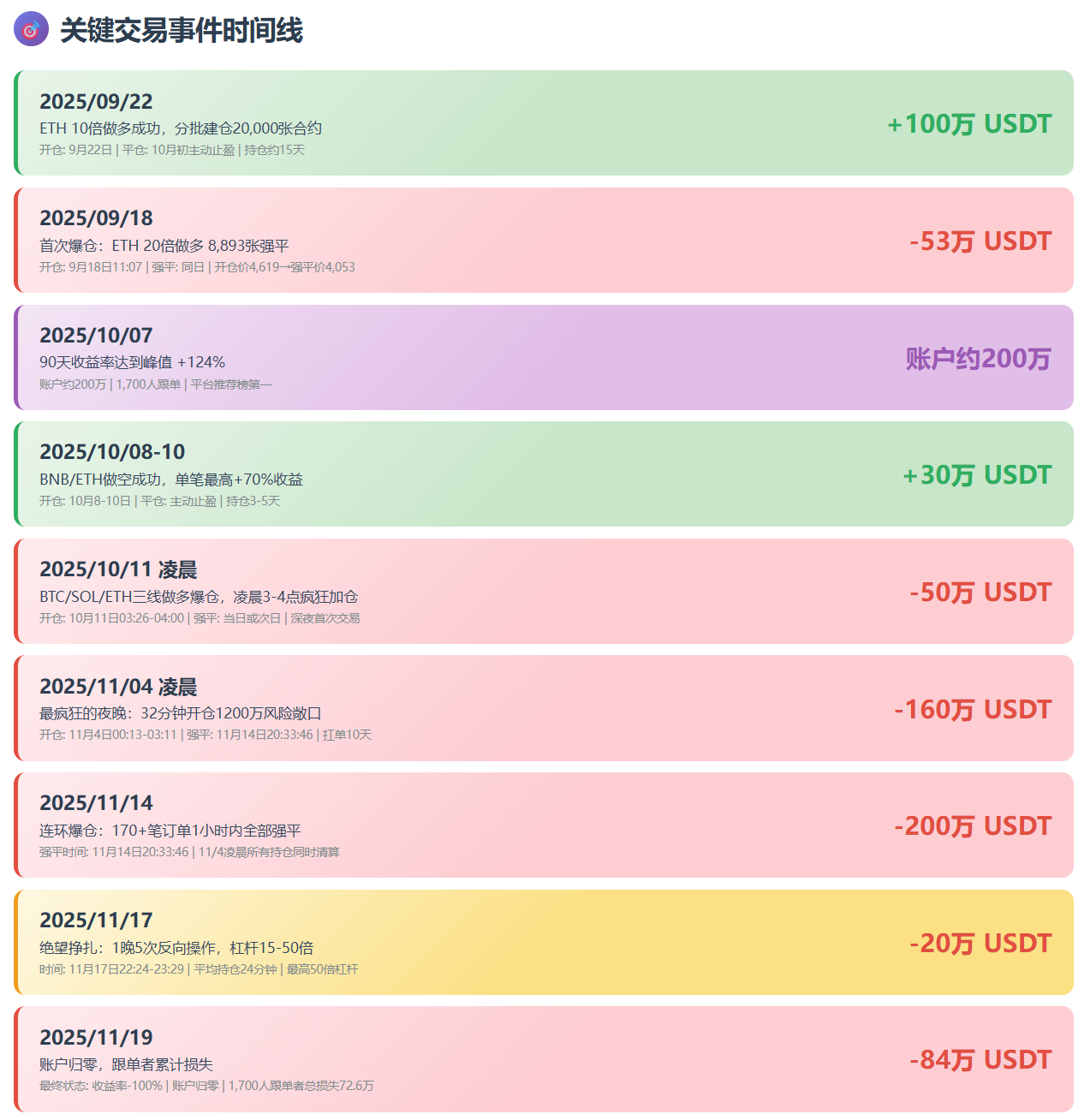 从数据可以看出,即使在11月中旬(已经接近崩溃边缘),他仍然能做出单笔盈利5万USDT的交易。11月16-17日的ETH空单使用32倍杠杆(已经很危险),但仍然获得了+135.35%的收益。这说明他的技术分析能力一直都在,只是被情绪和贪婪吞噬了。