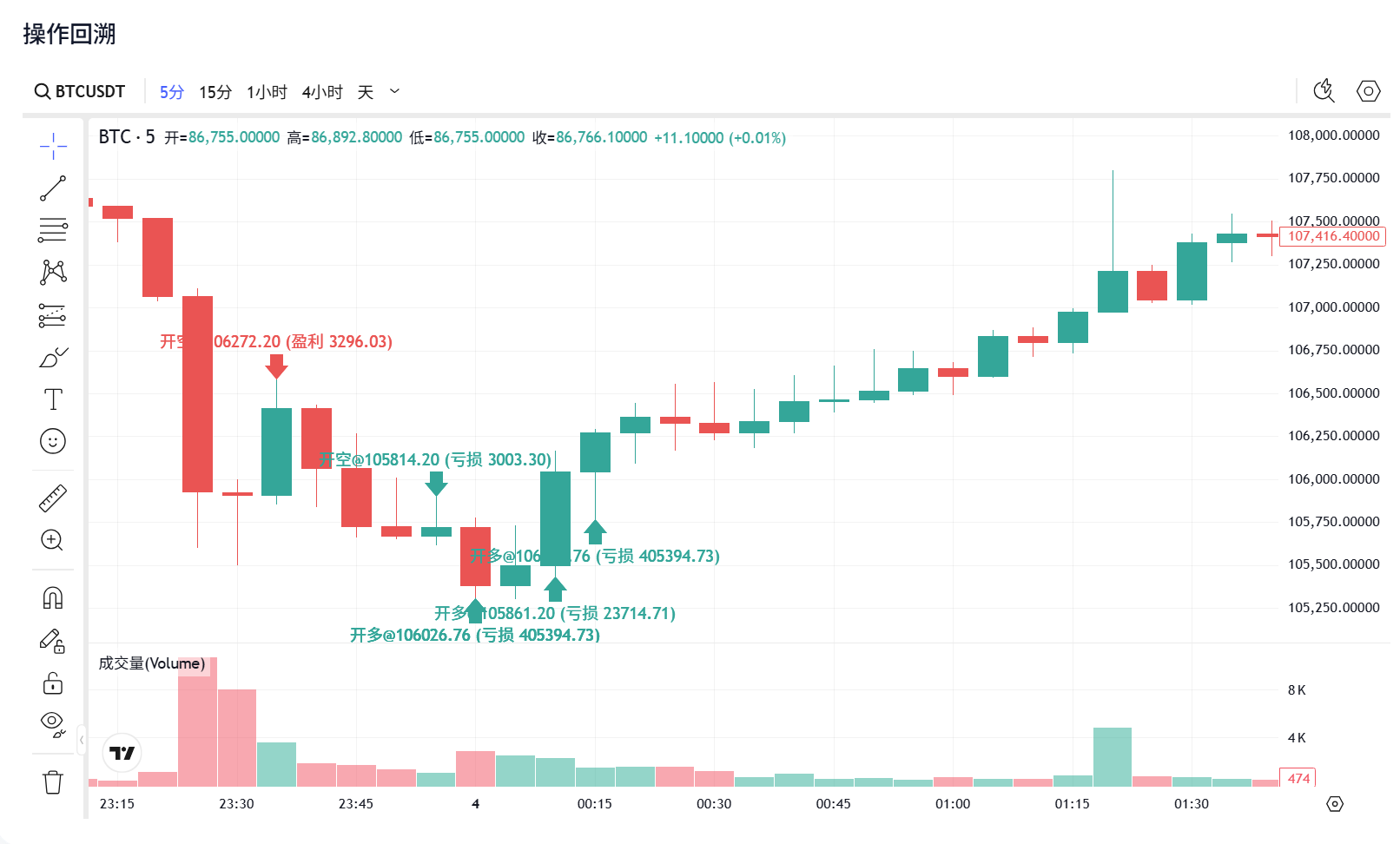 0:13-0:15(2分钟内):他同时开仓ETH和BTC,都使用20倍杠杆。ETH开仓19,744张,BTC开仓4,768张。这两分钟内,他开出了名义价值超过1100万USDT的风险敞口。