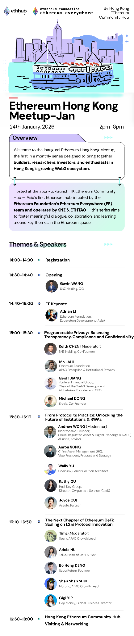 本次活动作为Hong Kong Ethereum Community Hub的首次公开亮相,特邀以太坊基金会生态系统发展亚洲负责人 Adrian Li、以太坊基金会机构隐私亚太负责人Mo Jalil,及全球以太坊关键赛道领军项目代表齐聚,以隐私合规、机构资产上链、Defi与Layer2三大前沿议题为核心,邀请到Chainlink、HashKey Group、Yunfeng Financial Group、ChinaAMC、Brevis、Asseto、Spark、Taiko、Morpho等核心项目及机构参与,旨在搭建高端专业交流平台,共探以太坊生态未来发展新方向,解锁行业创新密码。