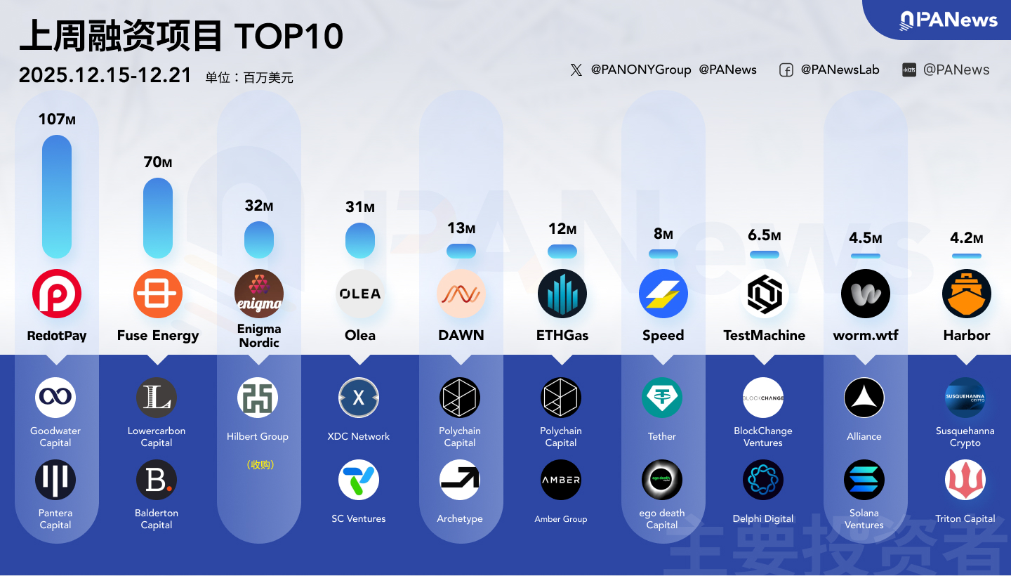 - 基础设施&工具方面公布了4起投融资事件,其中香港稳定币支付平台RedotPay完成1.07亿美元B轮融资,由Goodwater Capital领投;